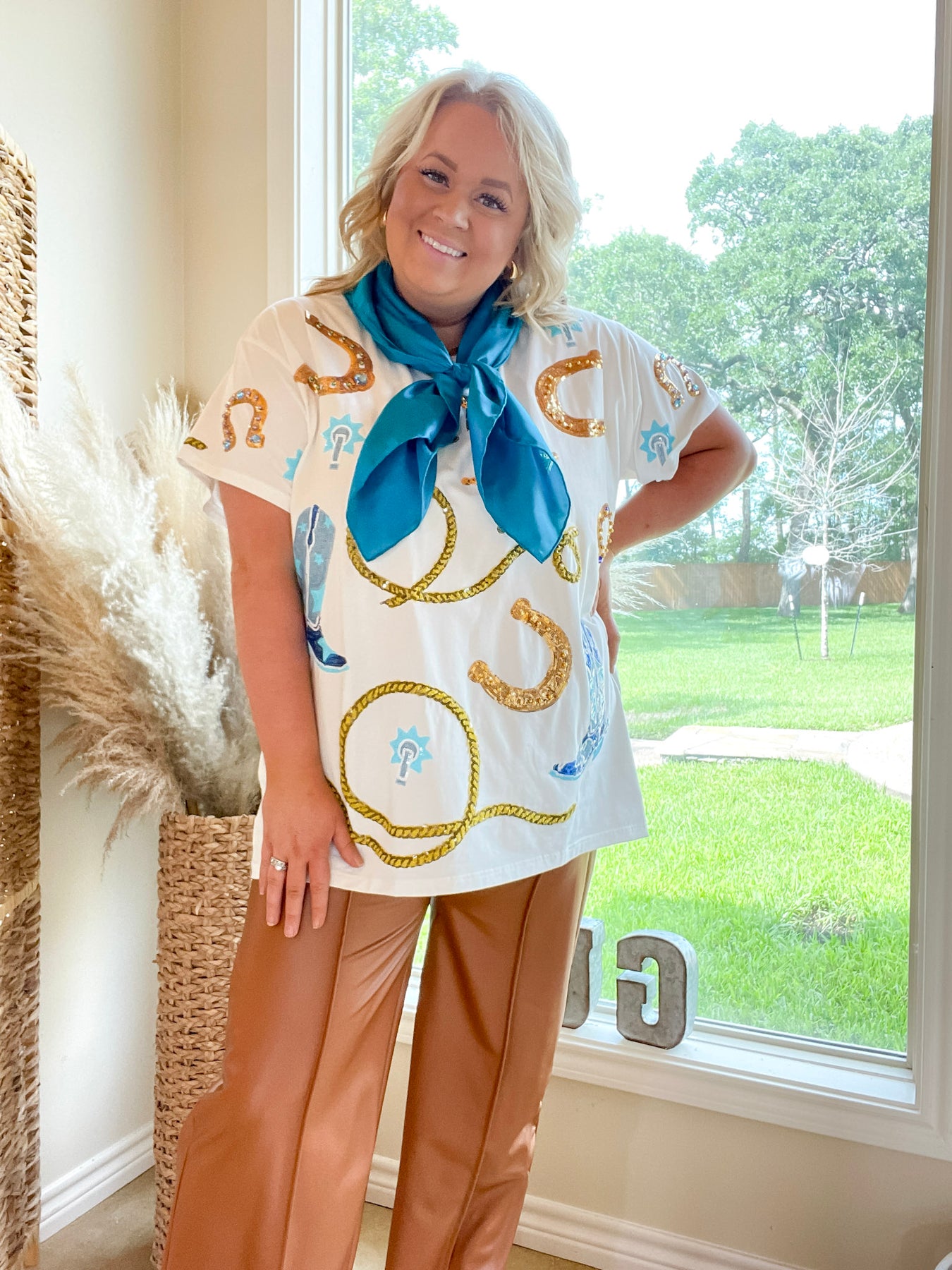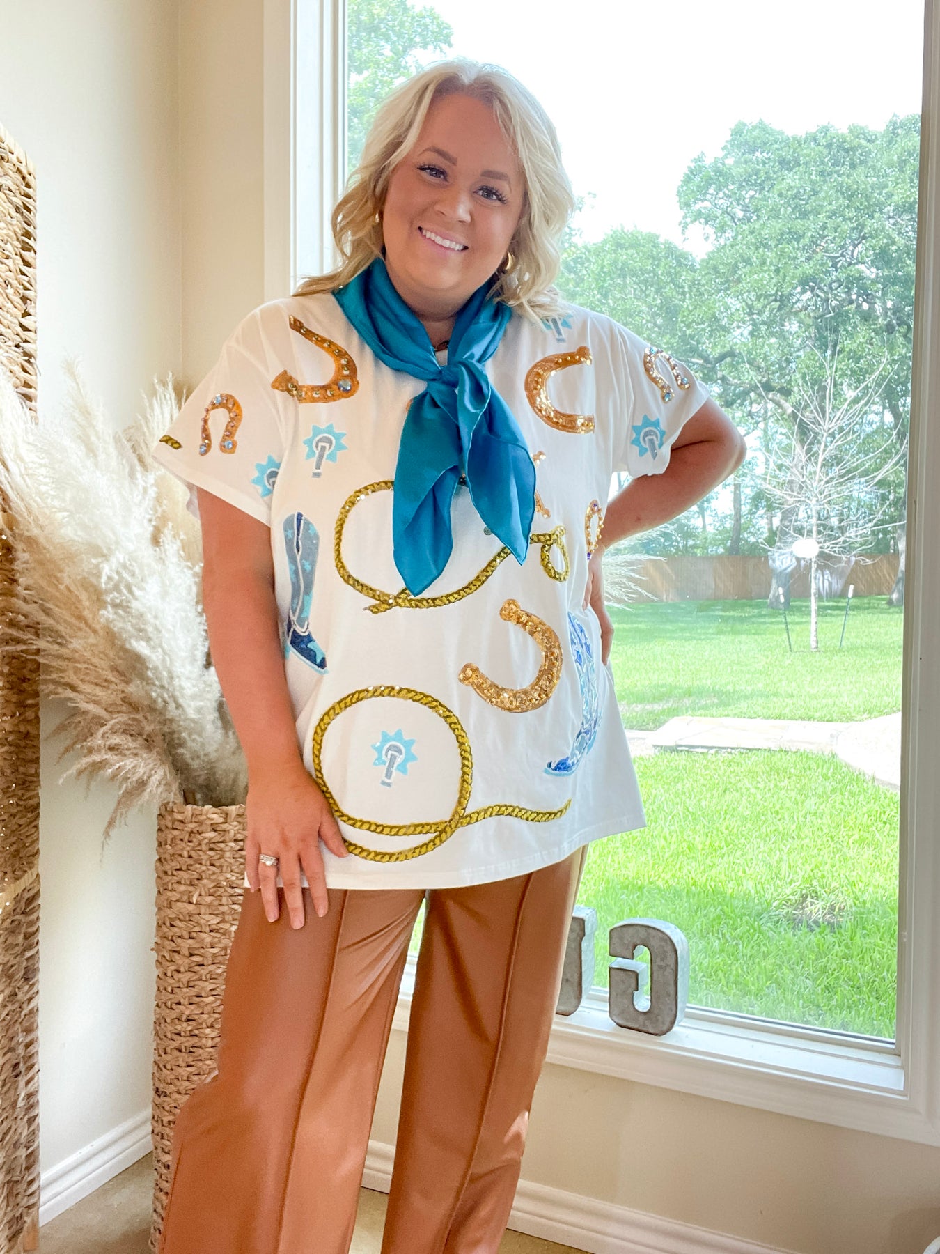 Welcome to the Wild West in style with our Queen Of Sparkles “Rope Me In” Sequin Top! Crafted with the softest fabric and sparkling rodeo sequins, you’ll love its casual, comfort fit and eye-catching flair. From a playful day to an evening out, this is the go-to top to make a bold statement.