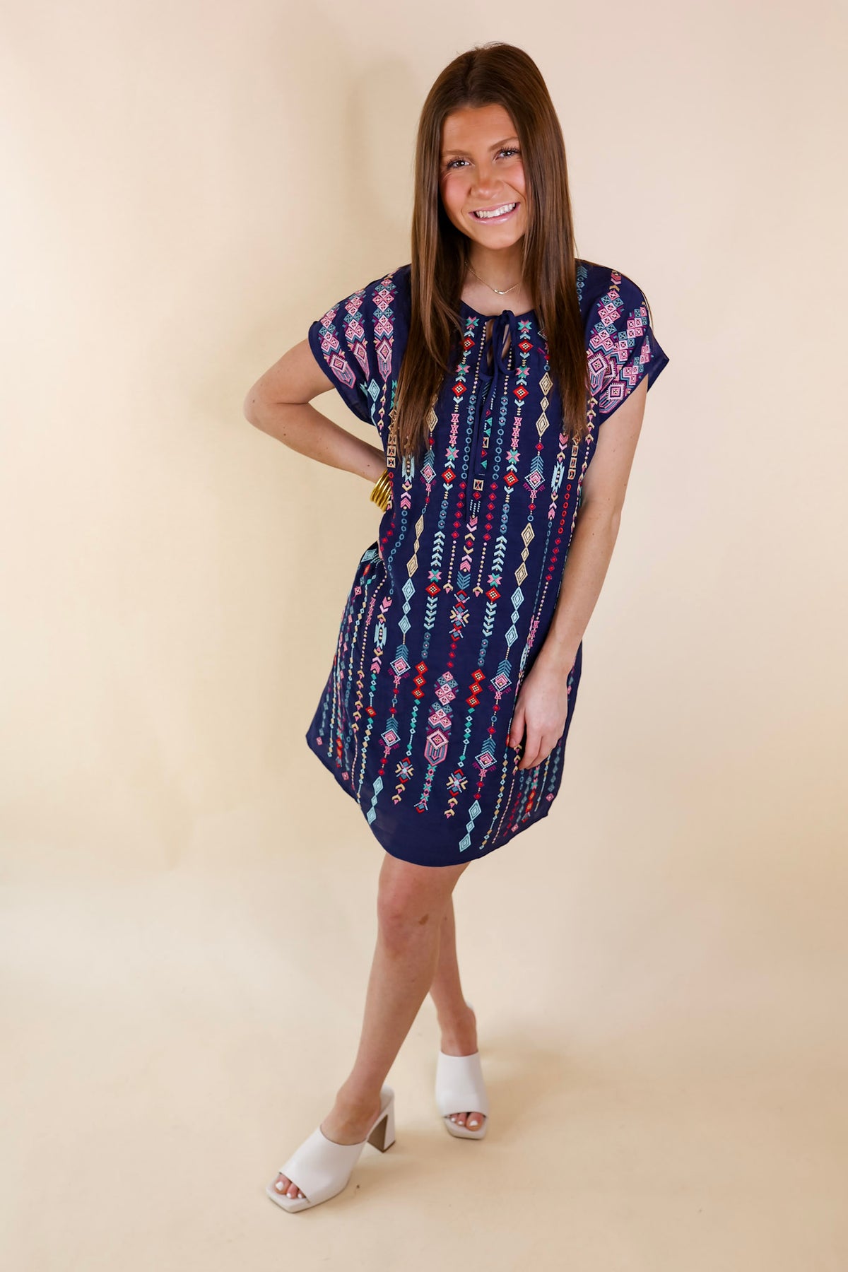 I have a love crush on this new dress! It includes cap sleeves, colorful tribal embroidery, a keyhole in the front that ties, and so much style! Pair it with wedges and jewelry and you're set! Dress is fully lined. Arte is wearing a size small.
