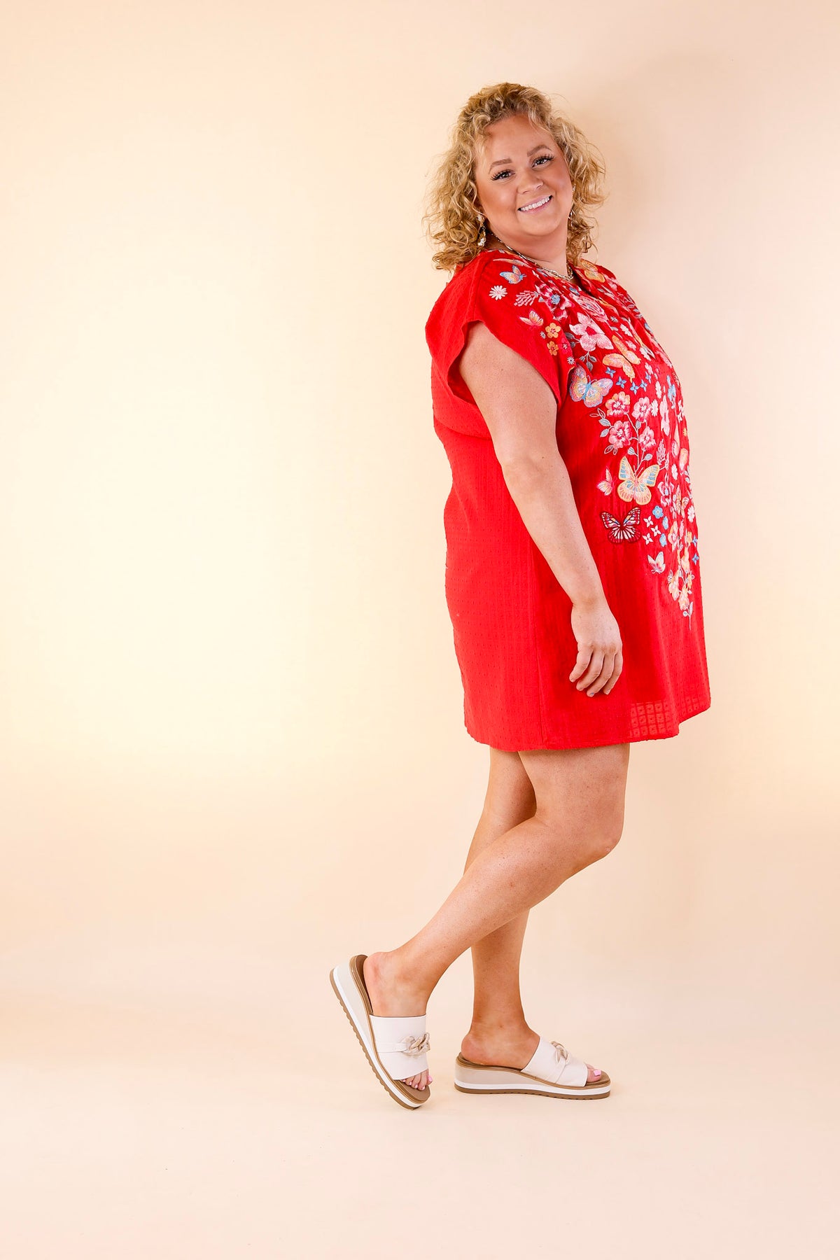 You'll get a lovely feeling when you put on this adorable new dress! it includes cap sleeves, a notched v neckline, and embroidery that consists of butterflies and flowers. Pair it with wedges and jewelry and you're set!