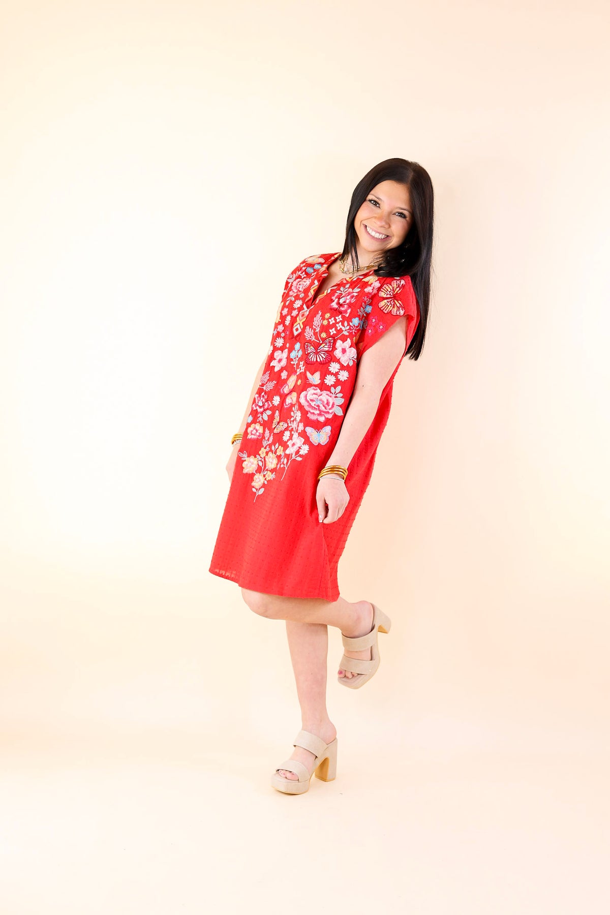 Lovely Feeling Floral Embroidered Dress with a Notched Neckline in Red