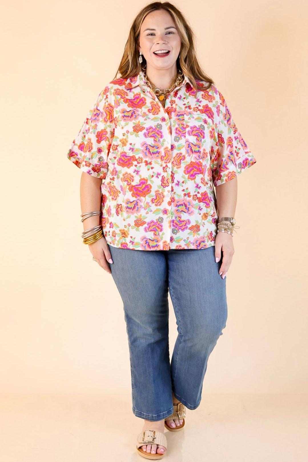 Elevate your wardrobe with our Enchanted Blooms top! Crafted with short sleeves and a classic collar, it showcases a stunning floral print for a touch of botanical charm. Available in sizes small to 3XL, this versatile piece promises effortless style for every occasion.