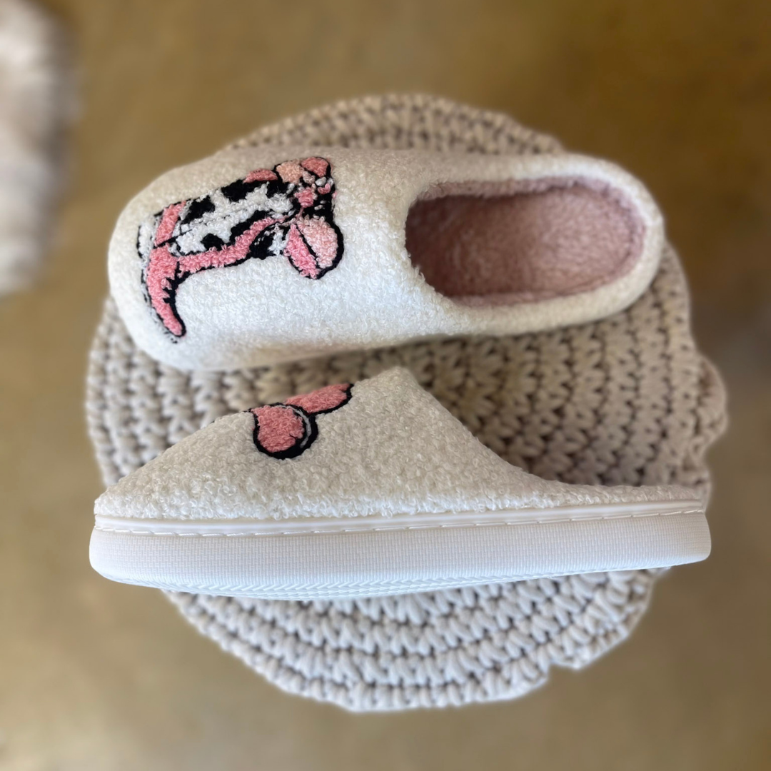 The Barefoot Bliss Fuzzy Slip-On House Shoes in Ivory with Western Icons bring a little southern charm to your cozy routine. Designed with soft plush fabric and a cute pink-and-cowprint western motif, these slippers are the perfect mix of comfort and personality. The fuzzy lining keeps your feet warm while the sturdy sole makes them easy to wear around the house or for a quick step outside. Comfy, trendy, and oh-so-you—your off-duty style just got even cuter.