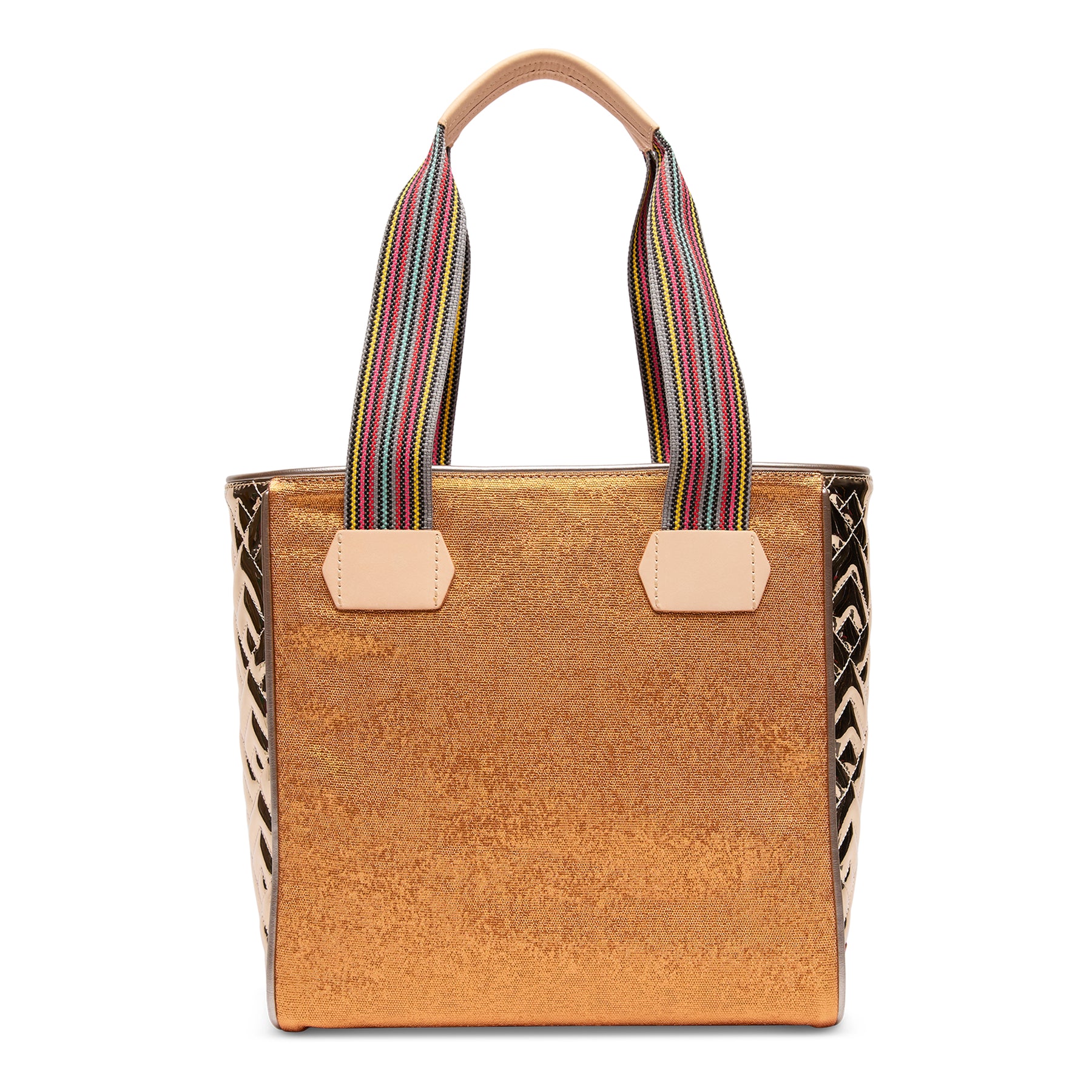 The Bronzer Classic Tote is consuela's signature Bag since the beginning. This tote bag holds its shape while carrying all of the essentials. Its gorgeous bronze background and floral embroidery combo is perfect for any occasion! Topped with comfortable woven handles, this multi-functional tote is trimmed in natural leather and crafted to hold its shape. Our tote features a roomy interior and pockets, ideal for carrying your laptop, keys, and phone.