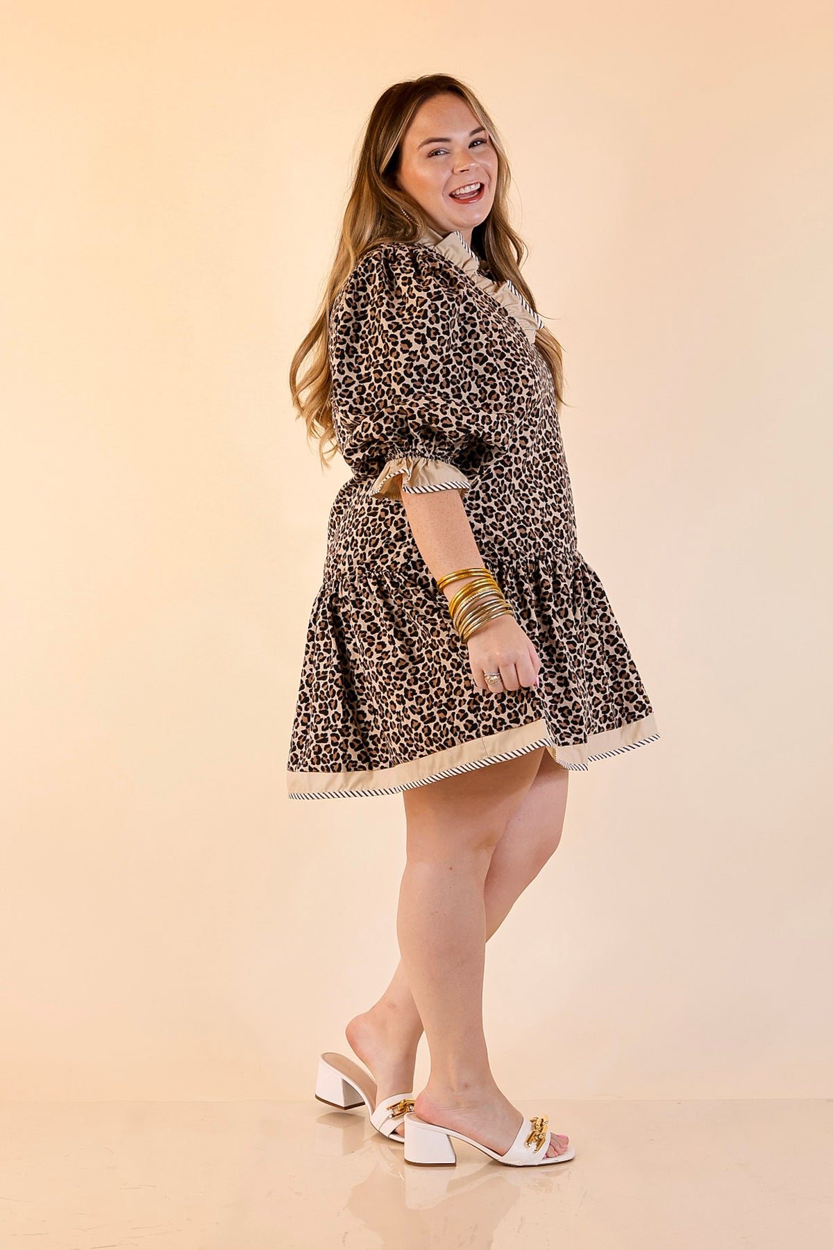 Fierce Intentions 3/4 Sleeve Leopard Print Babydoll Dress with Ruffle Detailing in Taupe