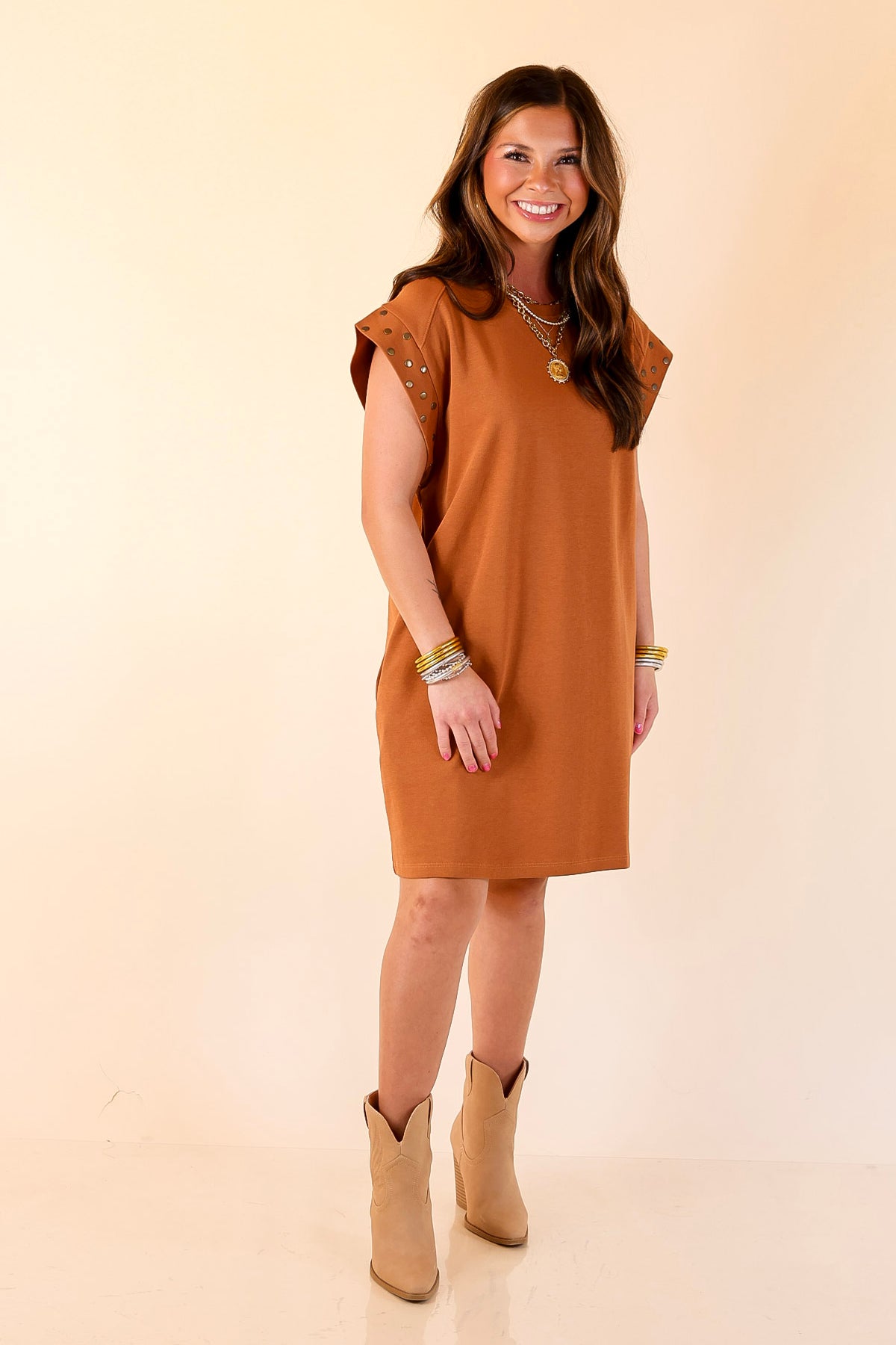 Graceful Glimpse Dress with Gold Stud Detail in Brown