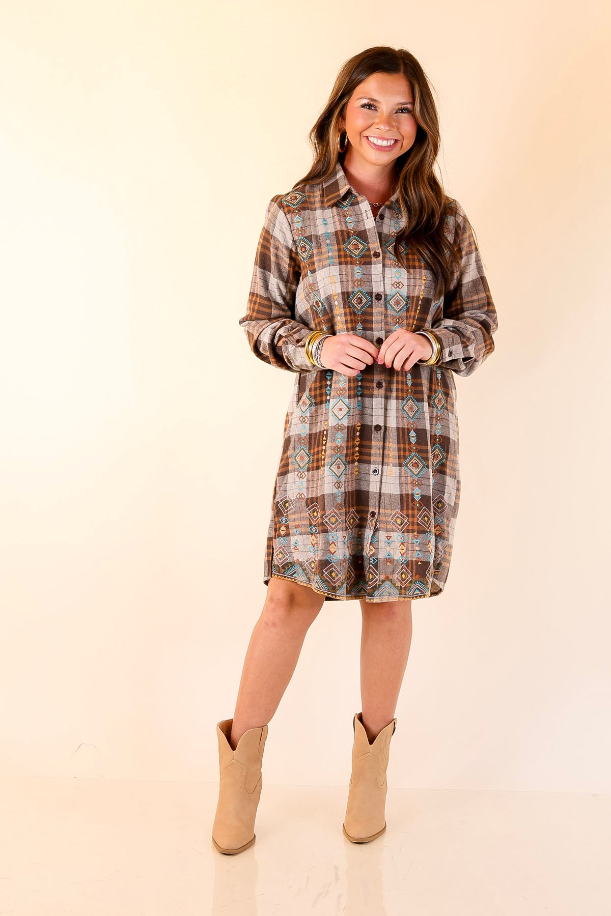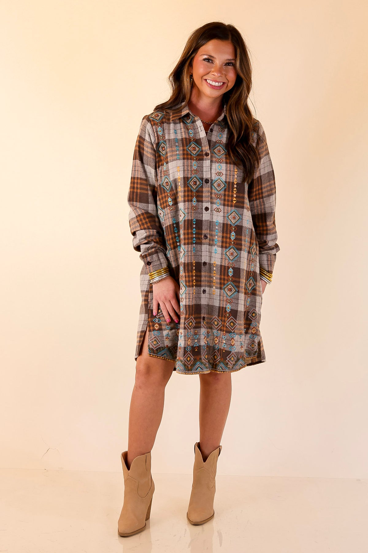Loving In Layers Tribal Embroidered Plaid Button Up Dress in Brown Mix