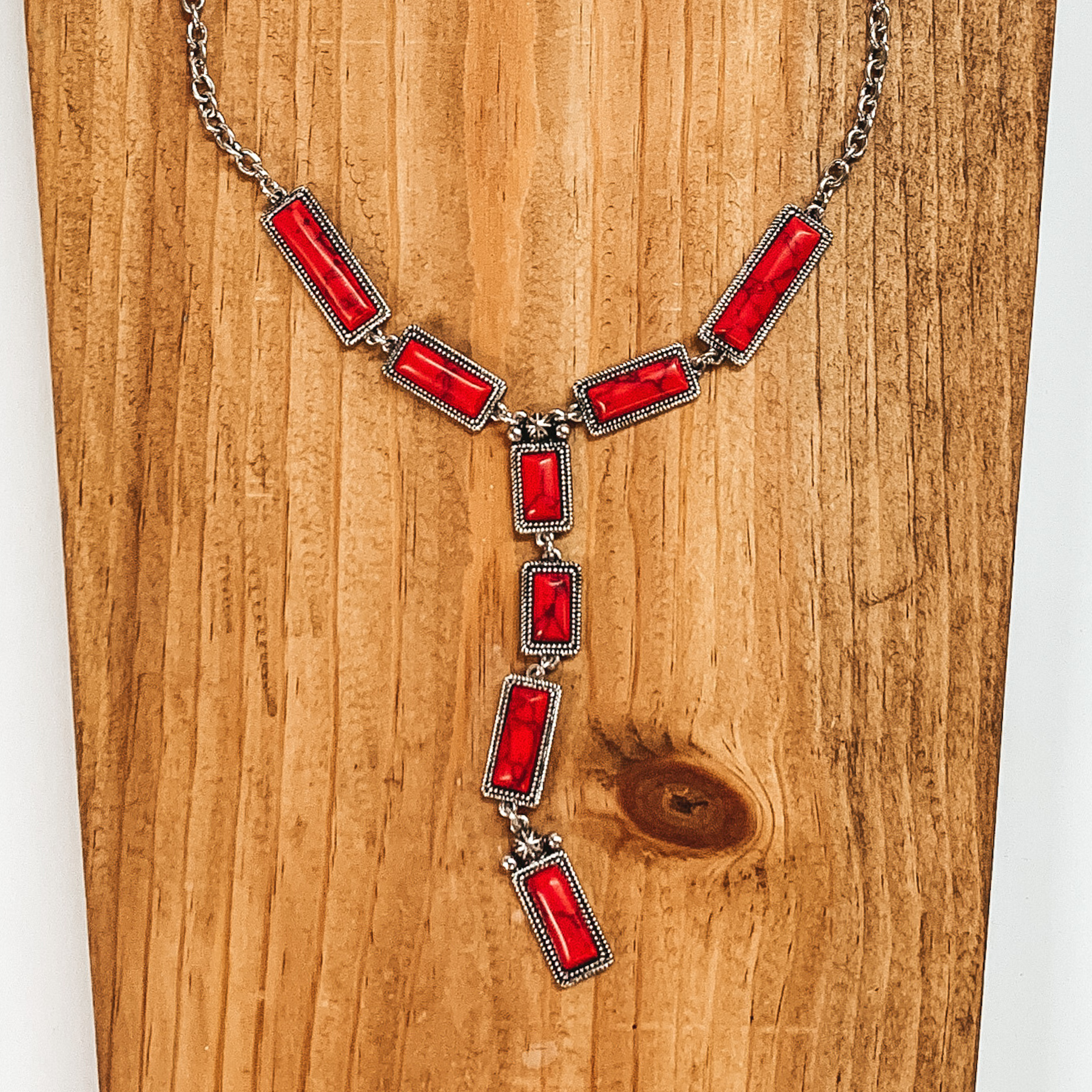 Silver Tone Lariat Necklace with Faux Red Stones