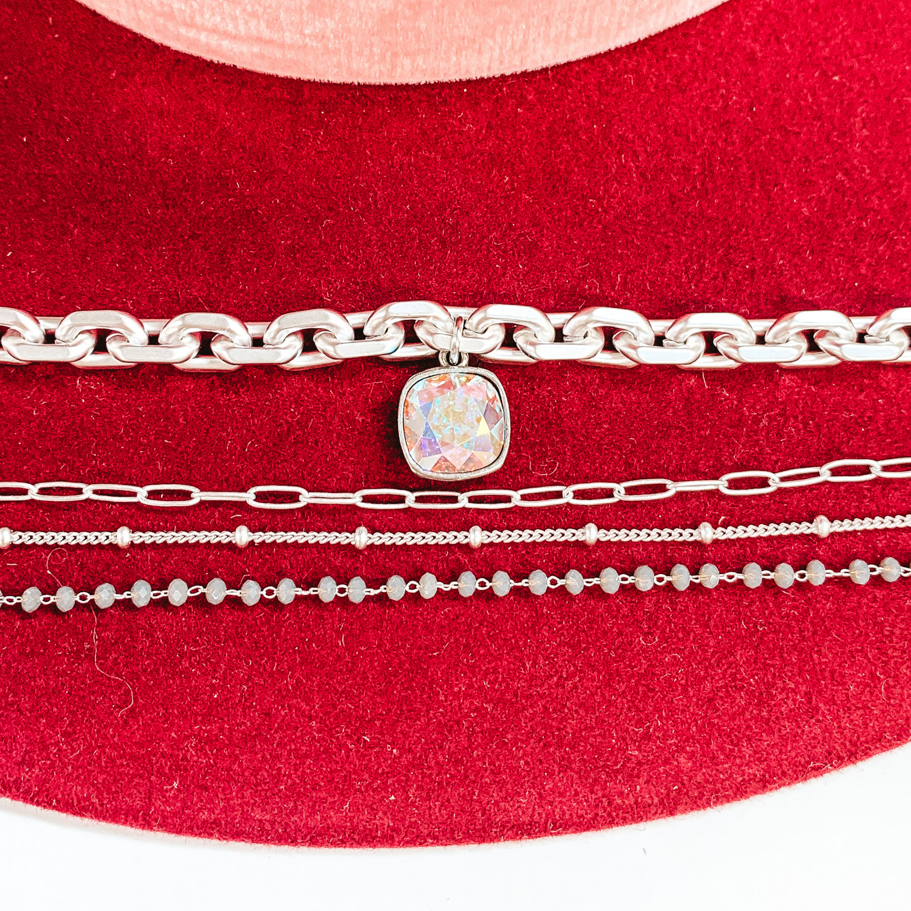 Pink Panache | Four Strand Crystal and Silver Chain Necklace with AB Cushion Cut Crystal Drop