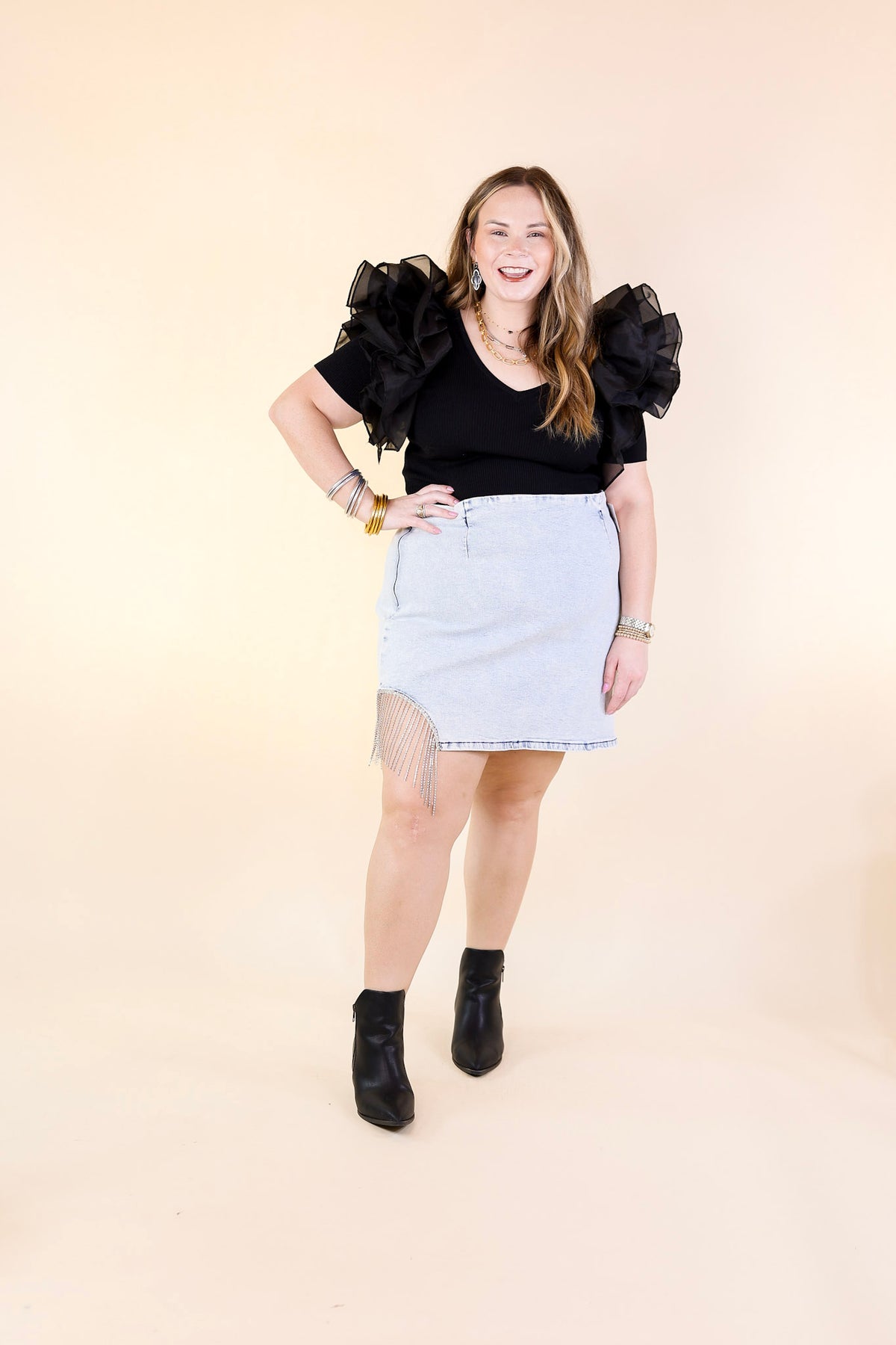 This adorable skirt will be there for your grandest moments! It includes a light wash denim body, a zip up closure on the hip, and crystal fringe detailing. Pair it with boots and a hat for a fun look this season!
