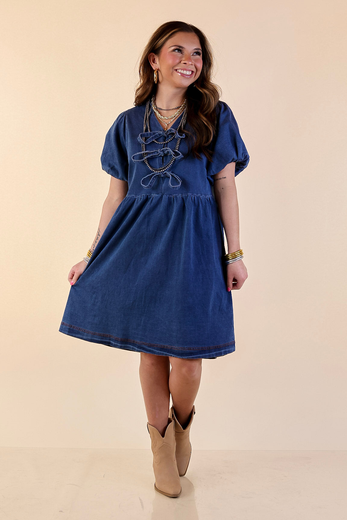 Timeless Trend Short Sleeve Denim Dress with Bows in Medium Wash