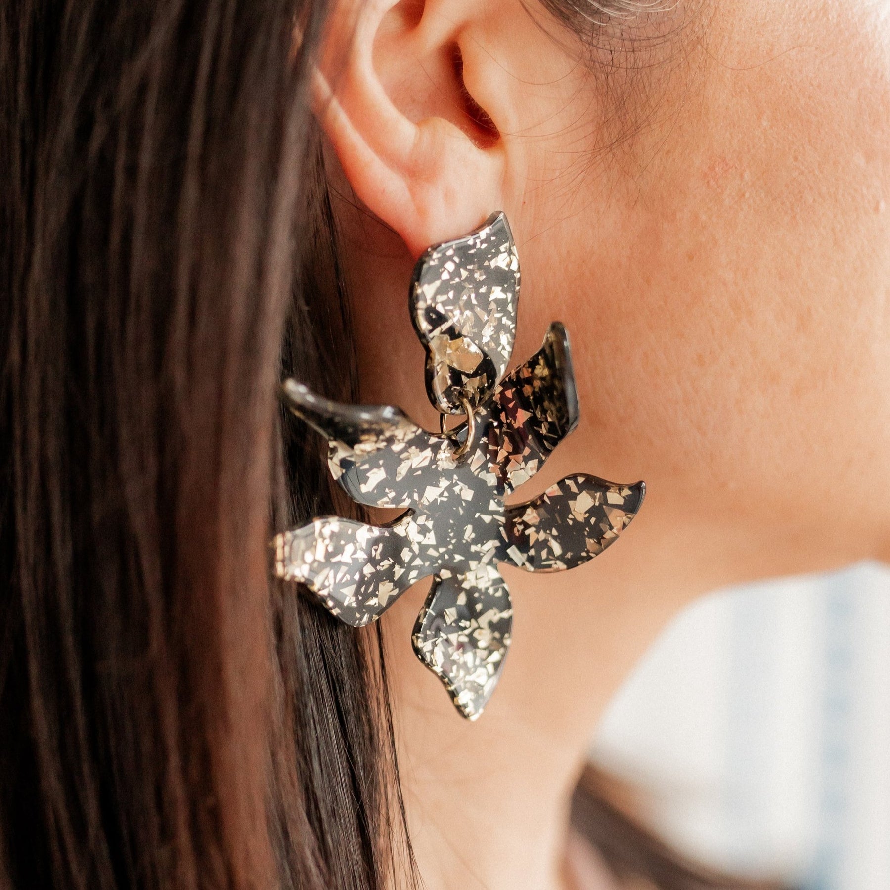 Discover the elegance of Linny Co Flora Earrings, designed for both style and comfort. These oversized earrings are crafted from 100% surgical-grade stainless steel and eco-friendly acetate, ensuring they are light, durable, and safe for sensitive ears. Featuring a black flower-shaped accents with shredded gold sequins and a metallic sheen, these statement earrings are copper and nickel-free, perfect for adding a touch of glamour to any outfit.