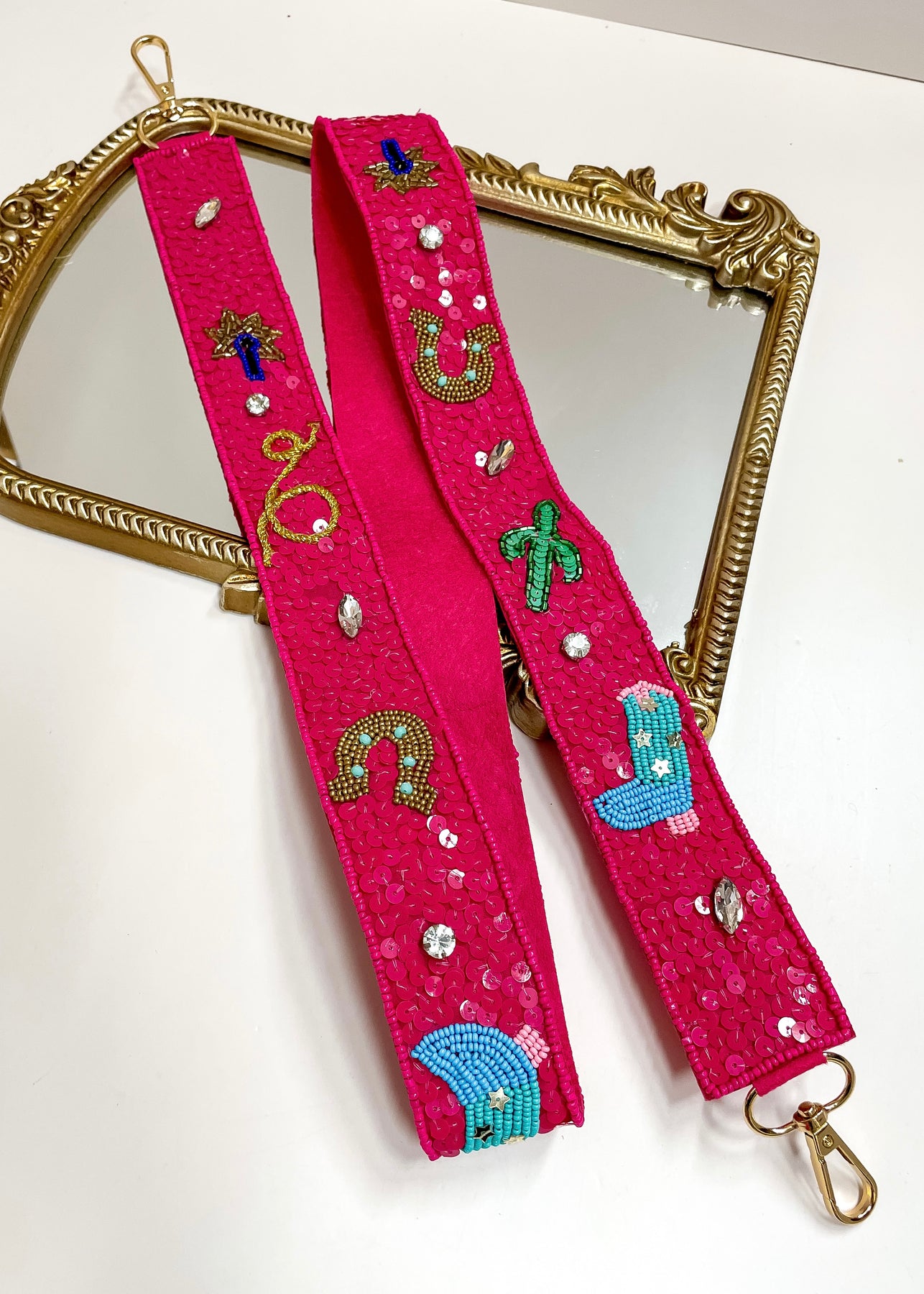 Add a little western magic to your favorite bag with this Cowgirl Charms beaded purse strap! 💫 Featuring a hot pink sequin base and detailed beaded icons — think cowboy boots, horseshoes, stars, cacti, and lassos — this strap is a total showstopper! Perfect for adding a pop of cowgirl glam to your everyday tote or gameday bag.
