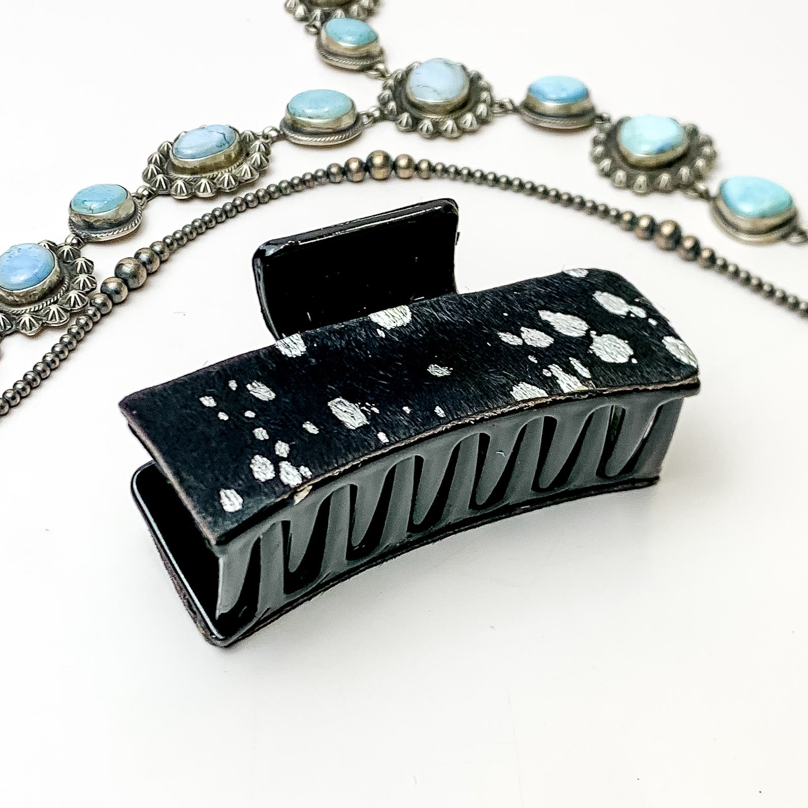 Black Rectangle Claw Clip with Black and Silver Acid Wash Cowhide