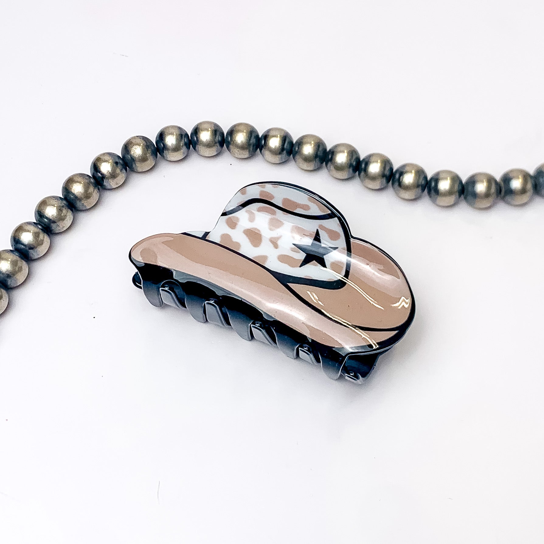 This is a leopard print cowboy hat in black, light purple, and pink. This hair clip is laying on a brown and ivory cow hide with a light brown felt hat in the back as decor.