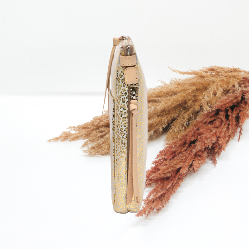 Our new, vertical crossbody has an extra front slip pocket and a side zip pocket to streamline your busy lifestyle. Zip it up and go! Kit is a foiled leather with gold jag print exterior.