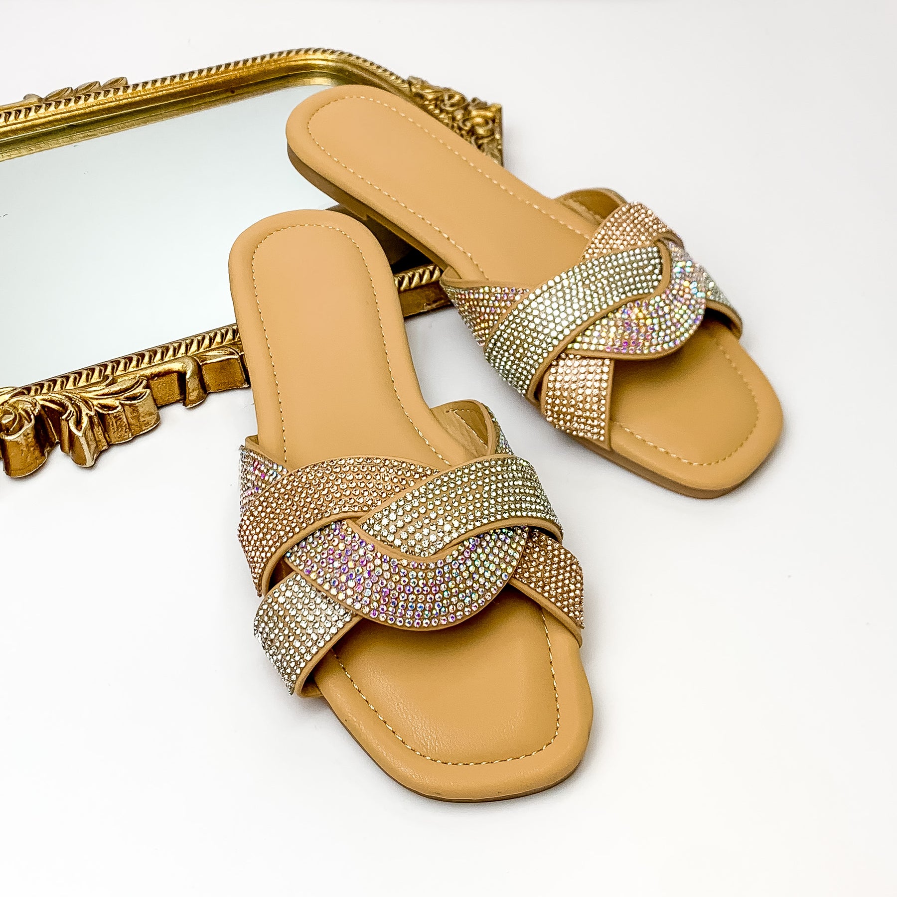 Tan sandals with three crystal bands overlapping for the strap. Each bands has a different color crystal including one clear crystal, one ab crystal, and one champagne crystal band. These sandals are pictured on a white background with a gold mirror in the top left corner.