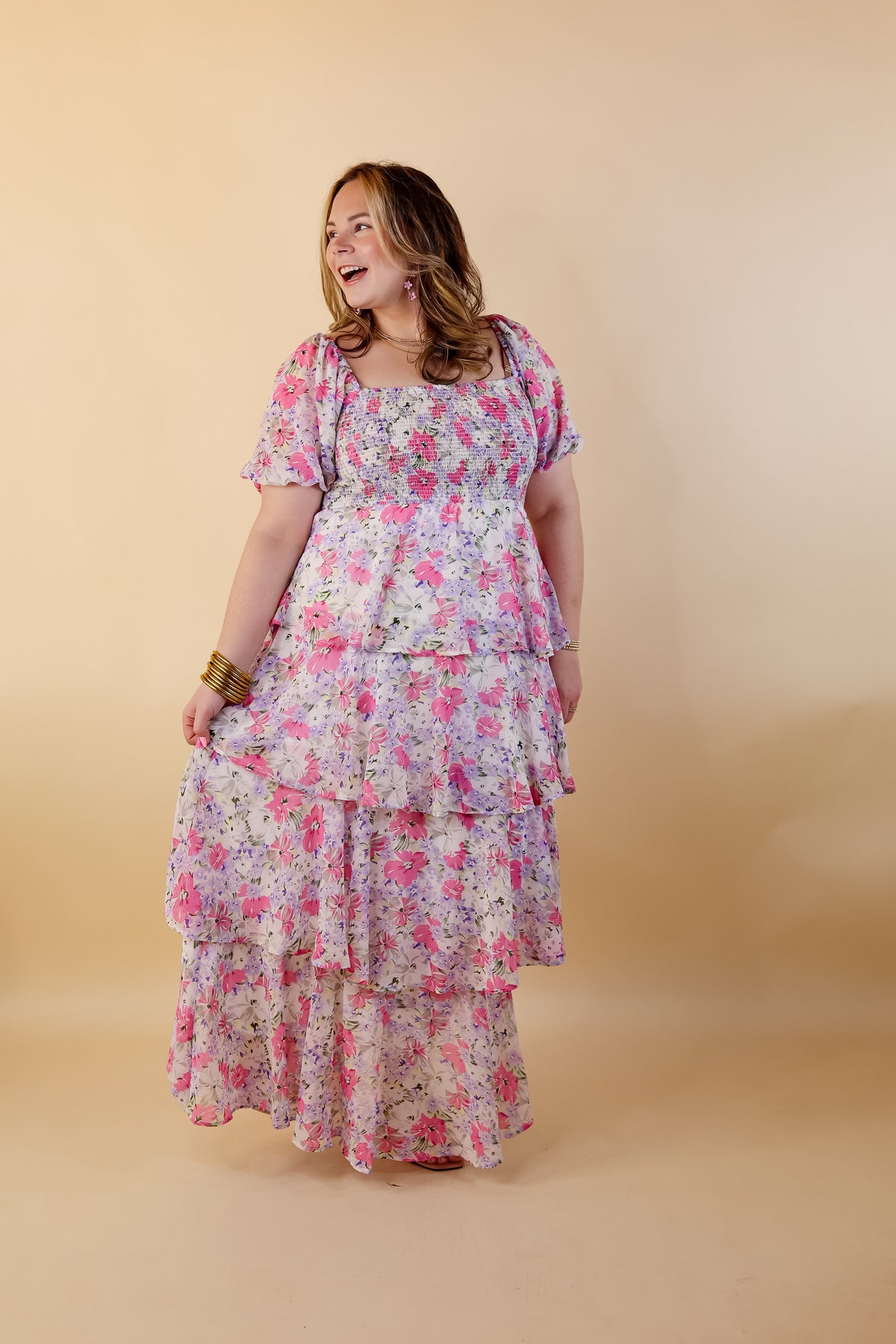 Fun Feeling Floral Tiered Maxi Dress with Smocked Balloon Sleeves in Pink Mix