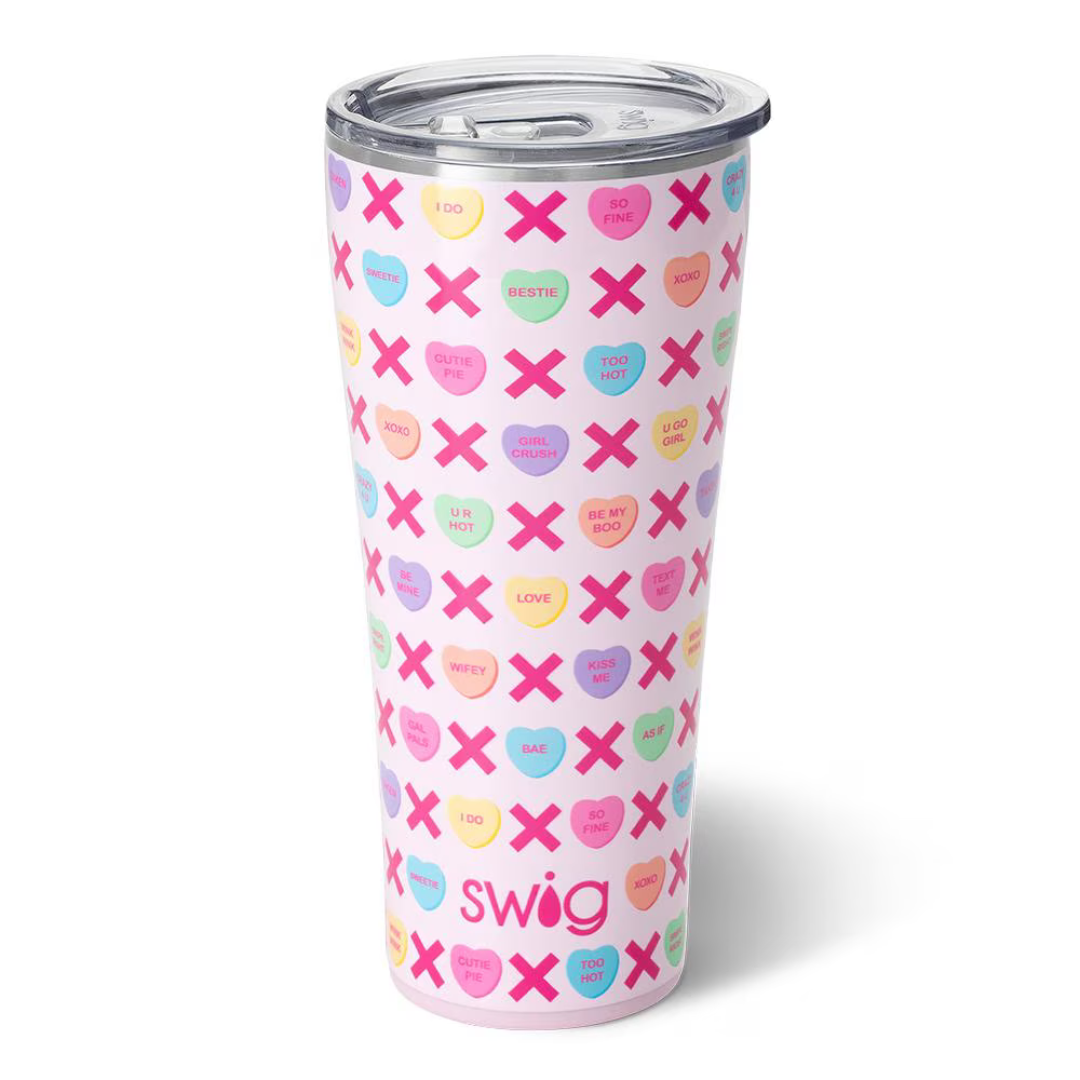 Bigger really is better! Bring laughter and love to your sweetheart this year with pastel candy conversational hearts on a glitter pink background.
