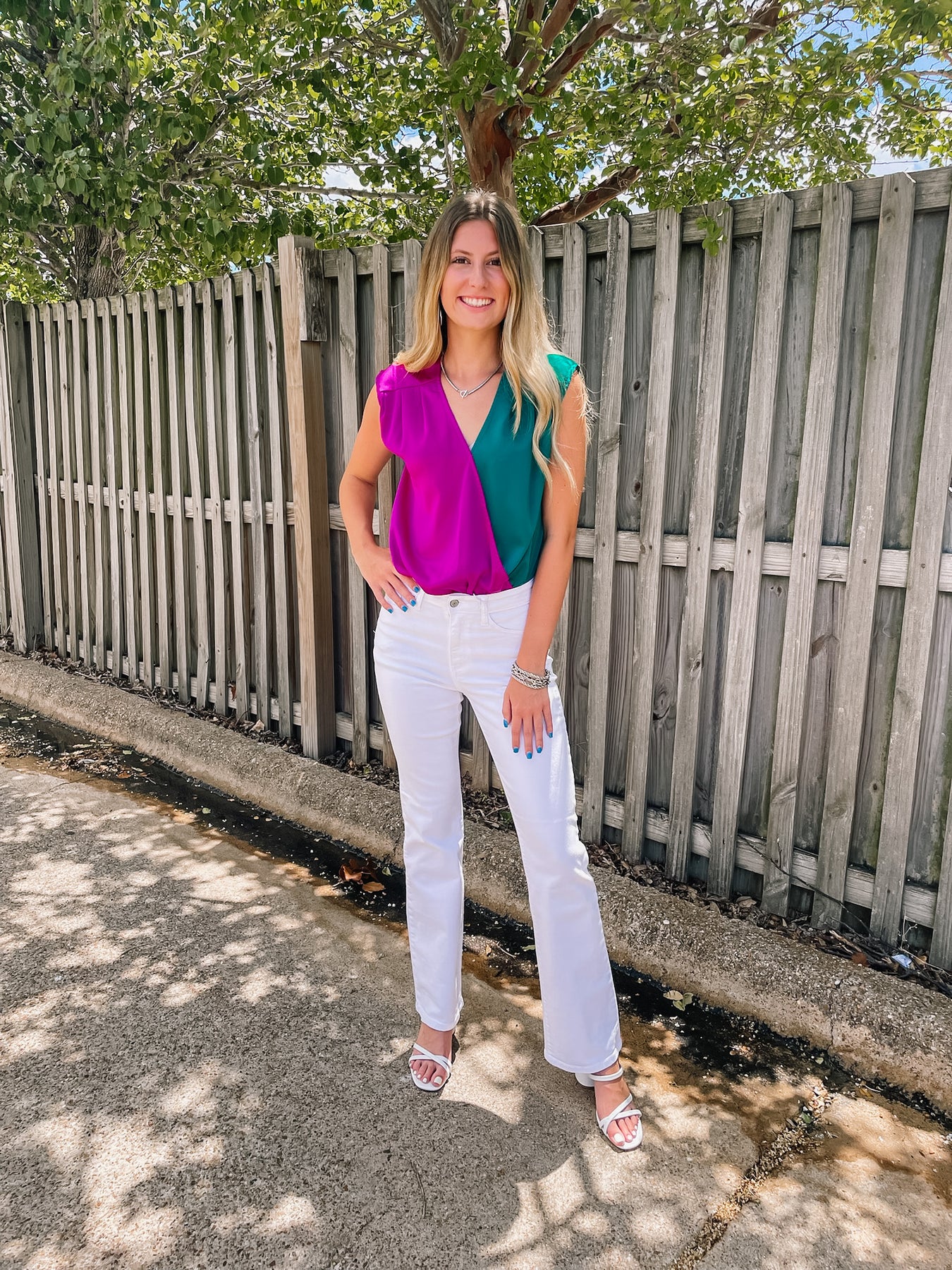 You'll steal the night when you wear this adorable bodysuit! It includes a v neckline with a button at the bust, a magenta purple right side, emerald green left side, a snap button at the bust to close it up more if preferred, and a two snap button closure at the bottom. Pair it with trousers and wedges for a fun look! Abby is wearing a size large.