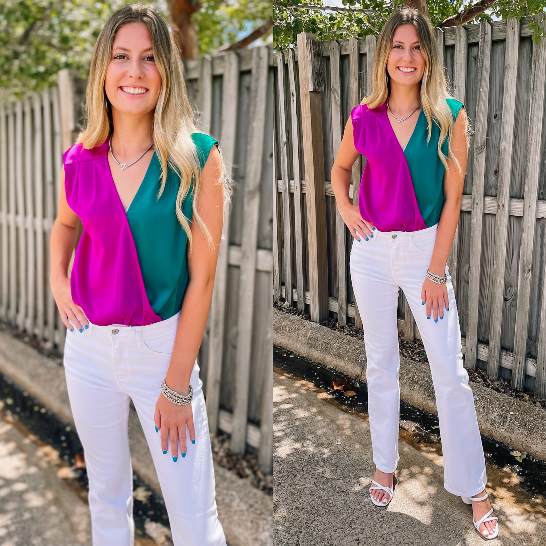 Steal The Night Color Block V Neck Bodysuit in Magenta and Teal Green