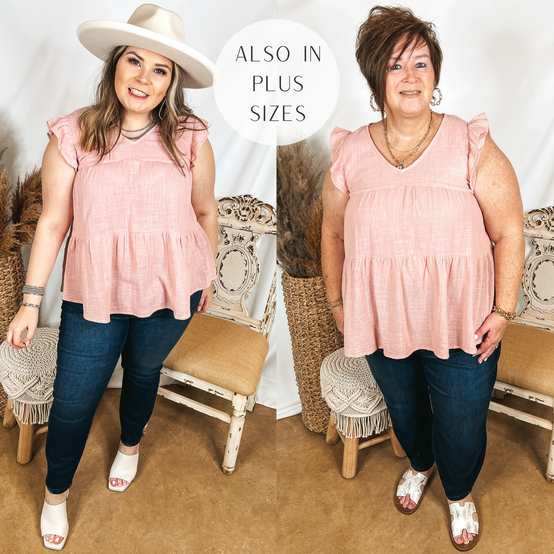 Models are wearing a dusty pink top with ruffle cap sleeves and a tiered body. Both models have it paired with dark wash, non-distressed jeans, white shoes, and jewelry.