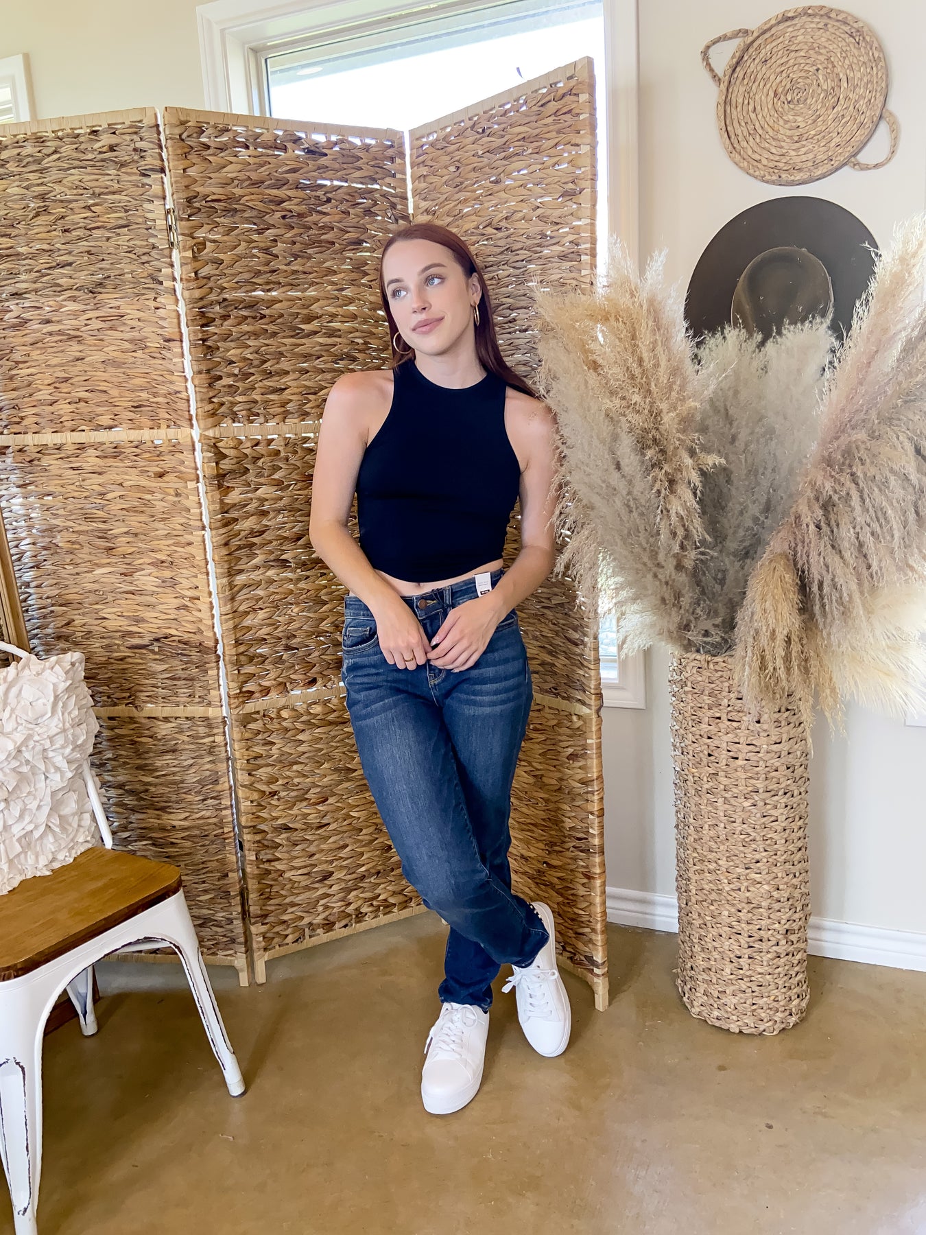 Model is wearings a black, scoop neck cropped tank top with dark blue jeans. She is also wearing gold hoops and white tennis shoes.