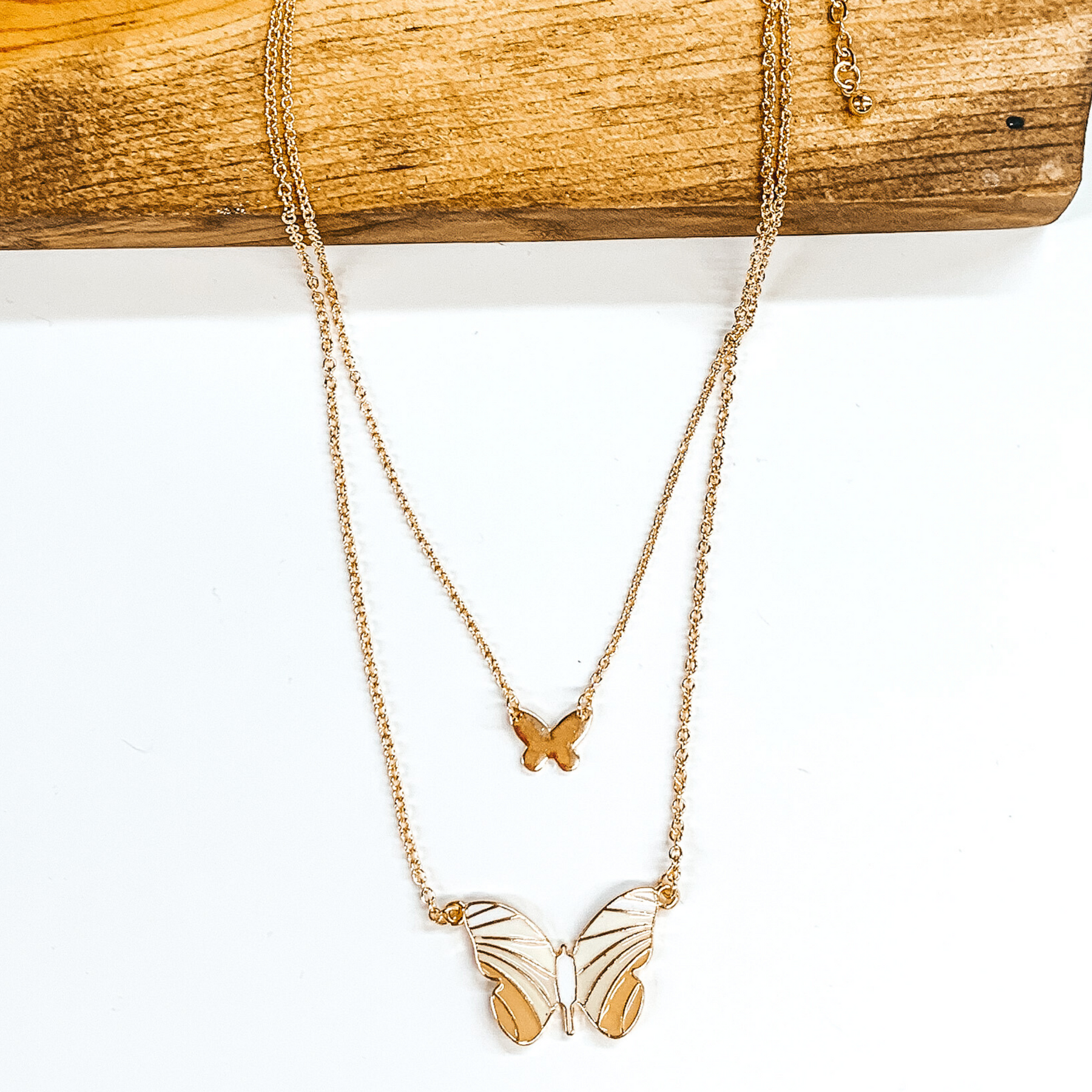 Double Gold Chain Necklace with a Butterfly Pendant in Ivory