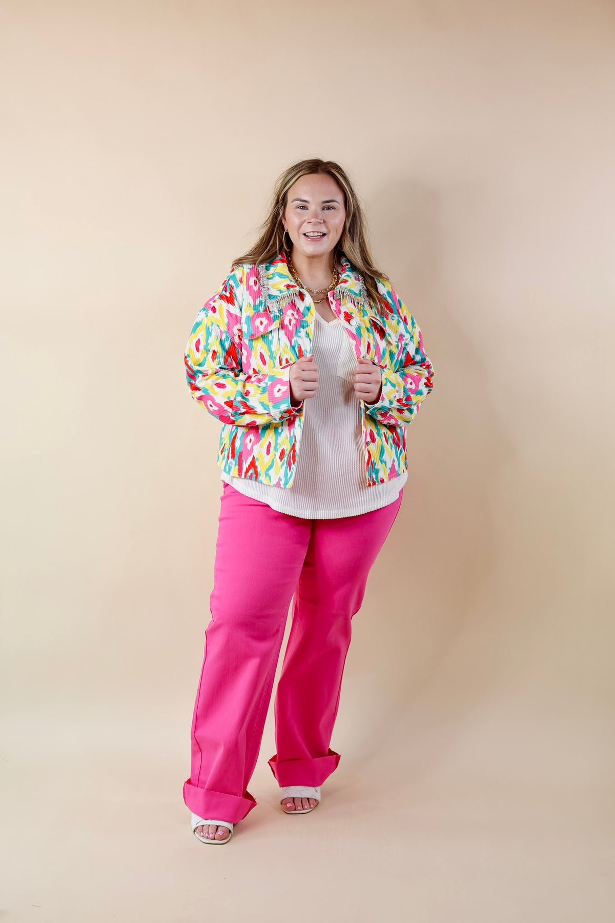 Chic Discovery Button Up Corduroy Jacket with Crystal Fringe in White Print