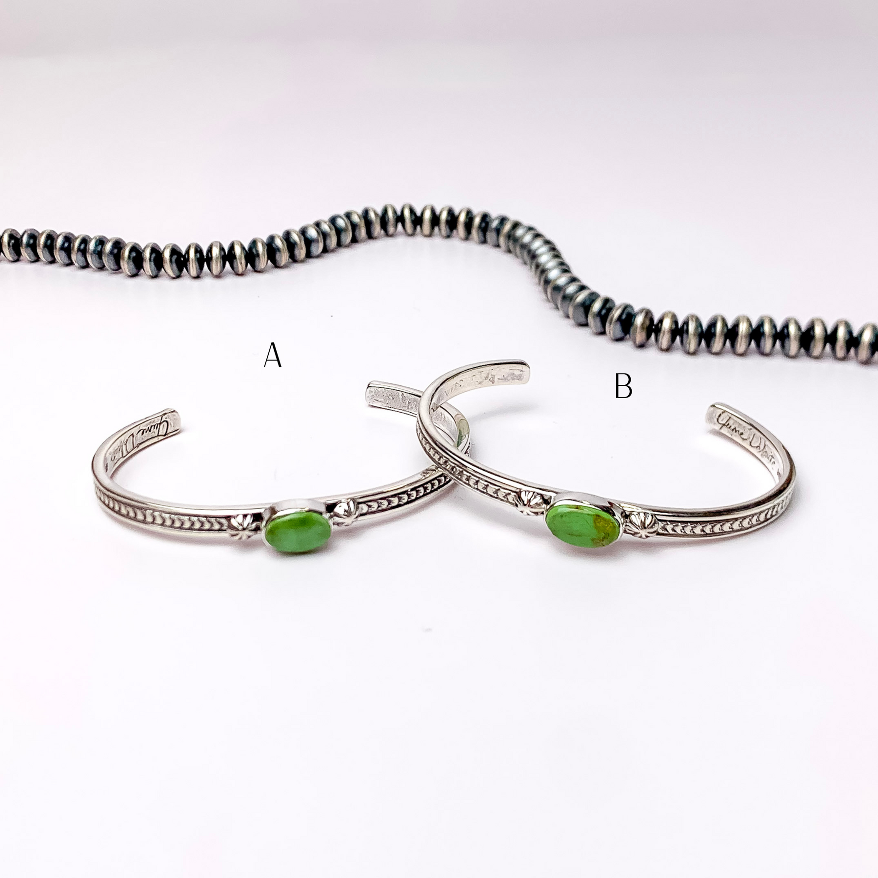 June Delauito | Navajo Handmade Sterling Silver Cuff Bracelet with a Single Green Turquoise Stone and Intricate Detailing