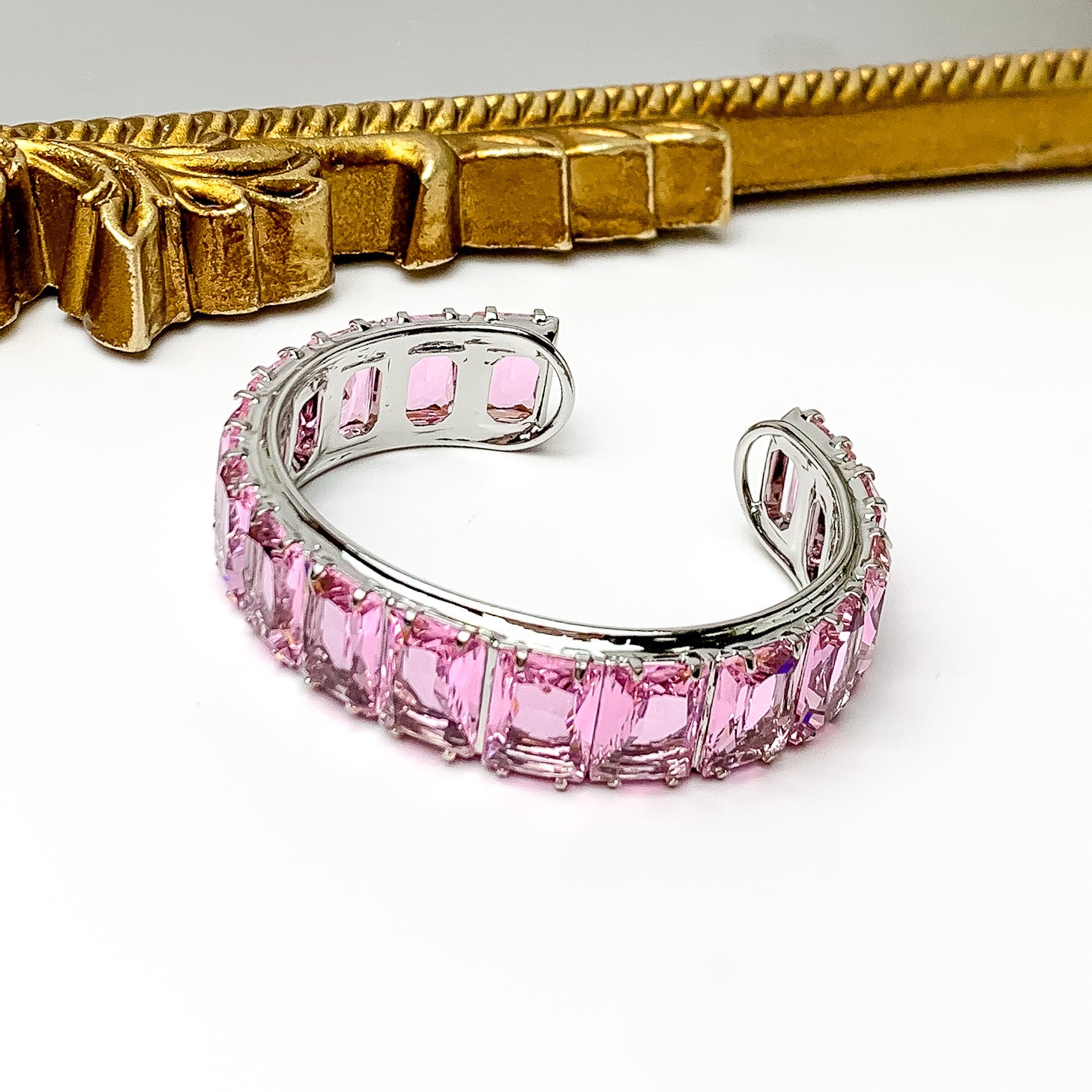 Silver bangle with a pink, rectangle crystal inlay. This bracelet is pictured on a white background with a gold mirror at the top of the picture.