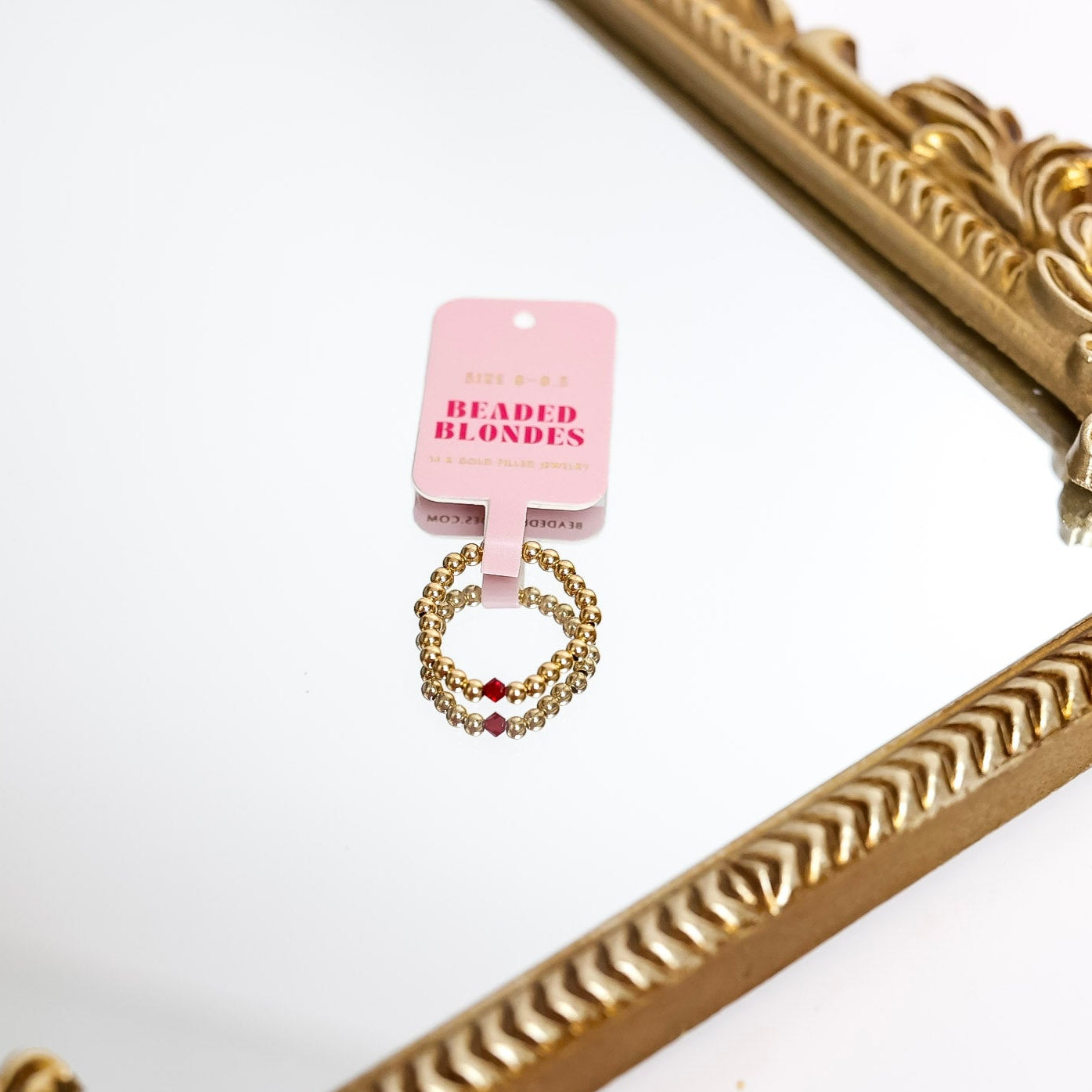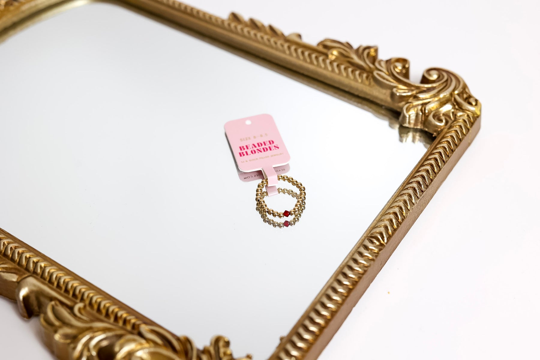 Our beaded rings are timeless and trendy! Our Rev Ring has one singular maroon Swarovski alongside 2.5mm beads.