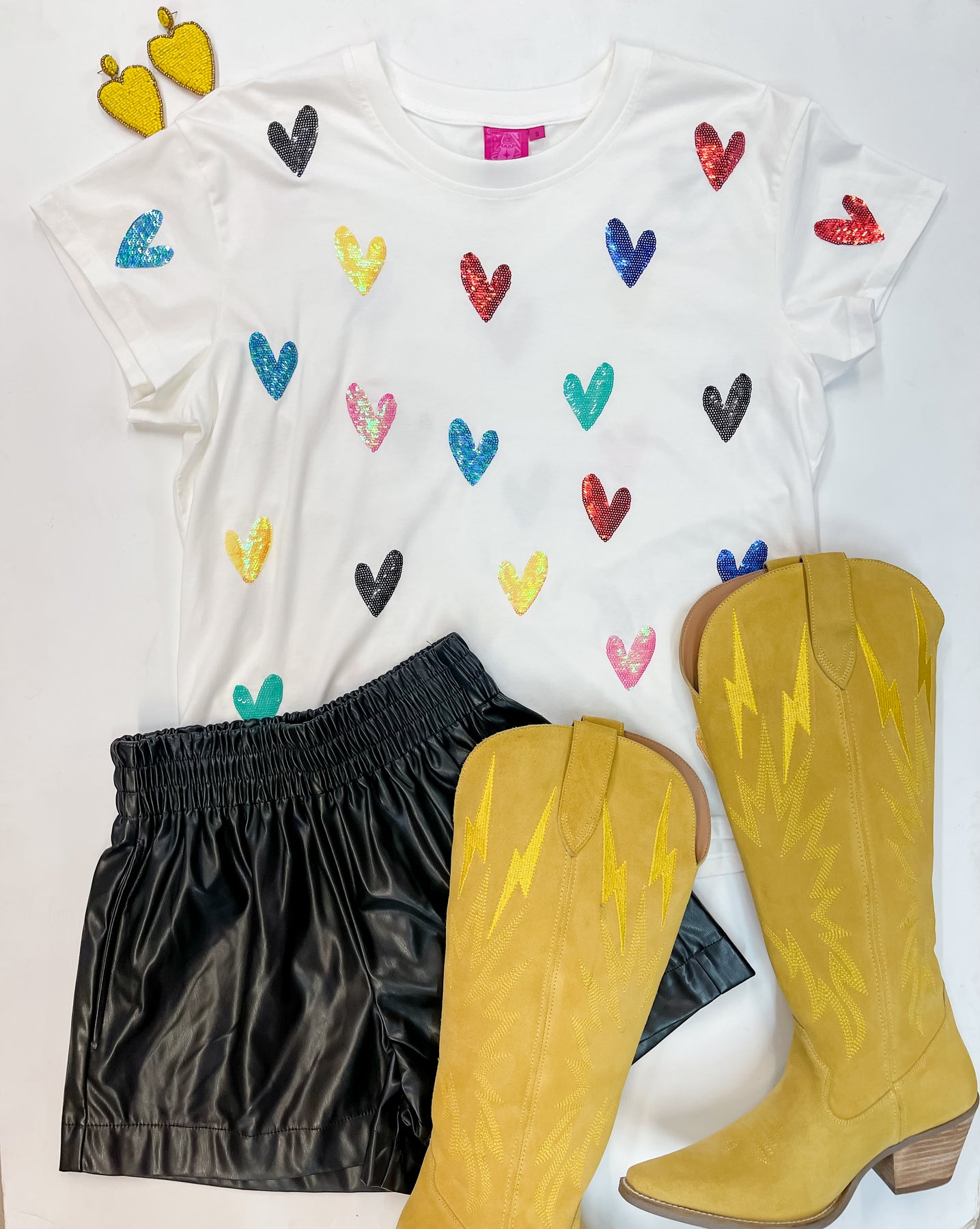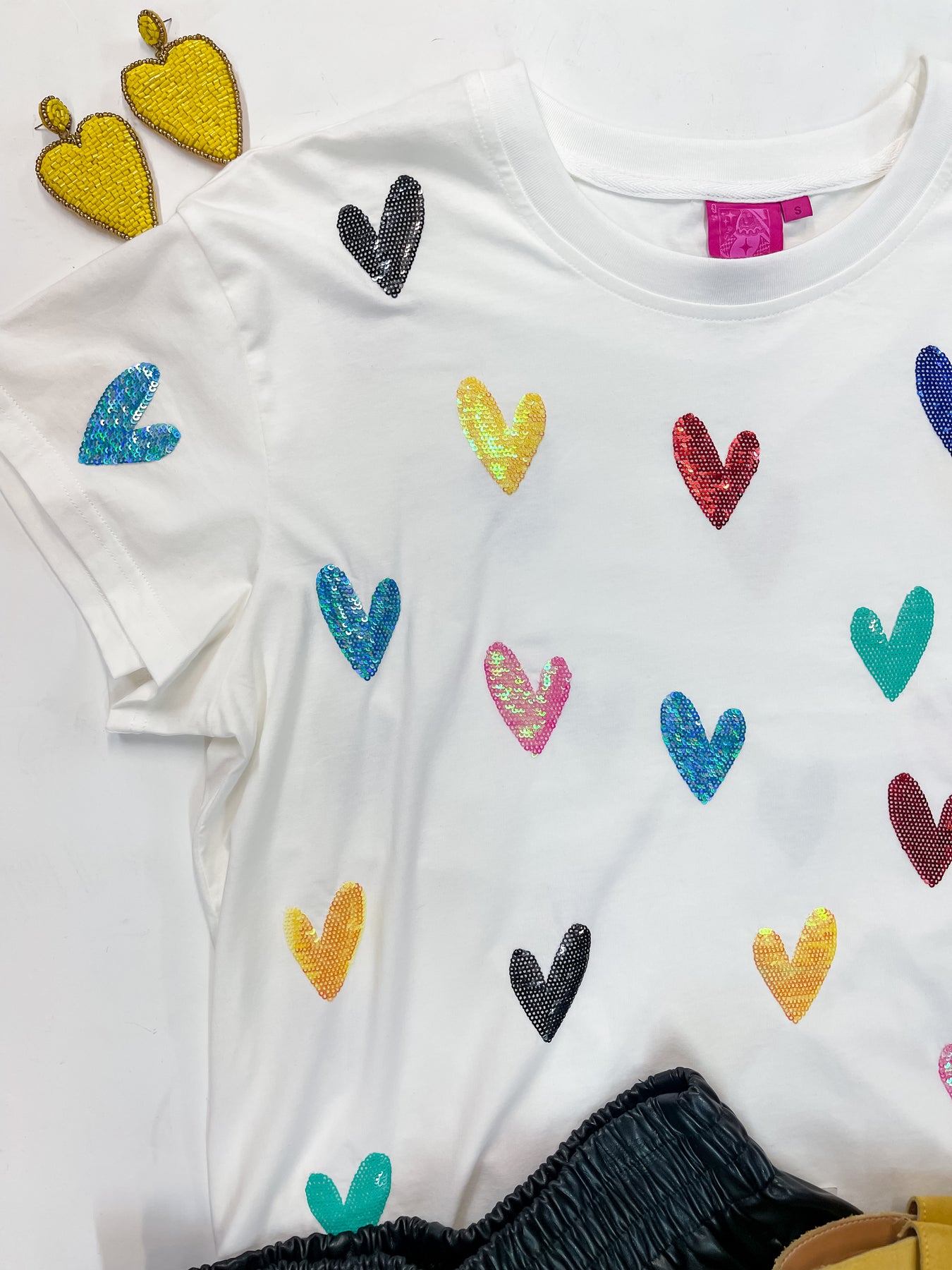 Dazzle in love with our Queen of Sparkles White Crew Neck Tee. Front to back, fully sequined multi-colored hearts illuminate your style. This tee is a vibrant celebration of love and glamour. Shine bright in every shade!