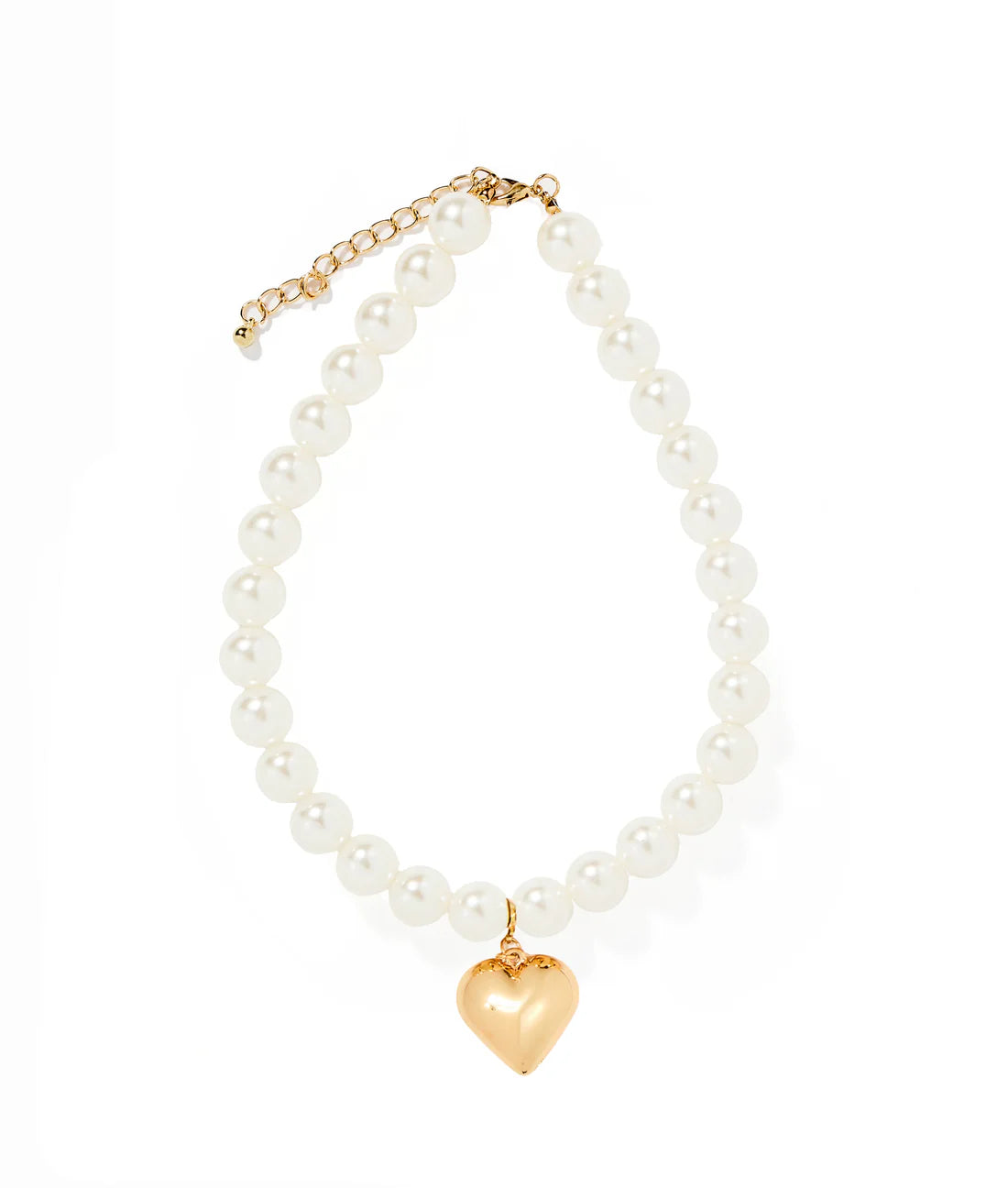 Sabrina in Pearl is a 17in pearl ball necklace with a 3in extender. It has a removable gold heart pendant.