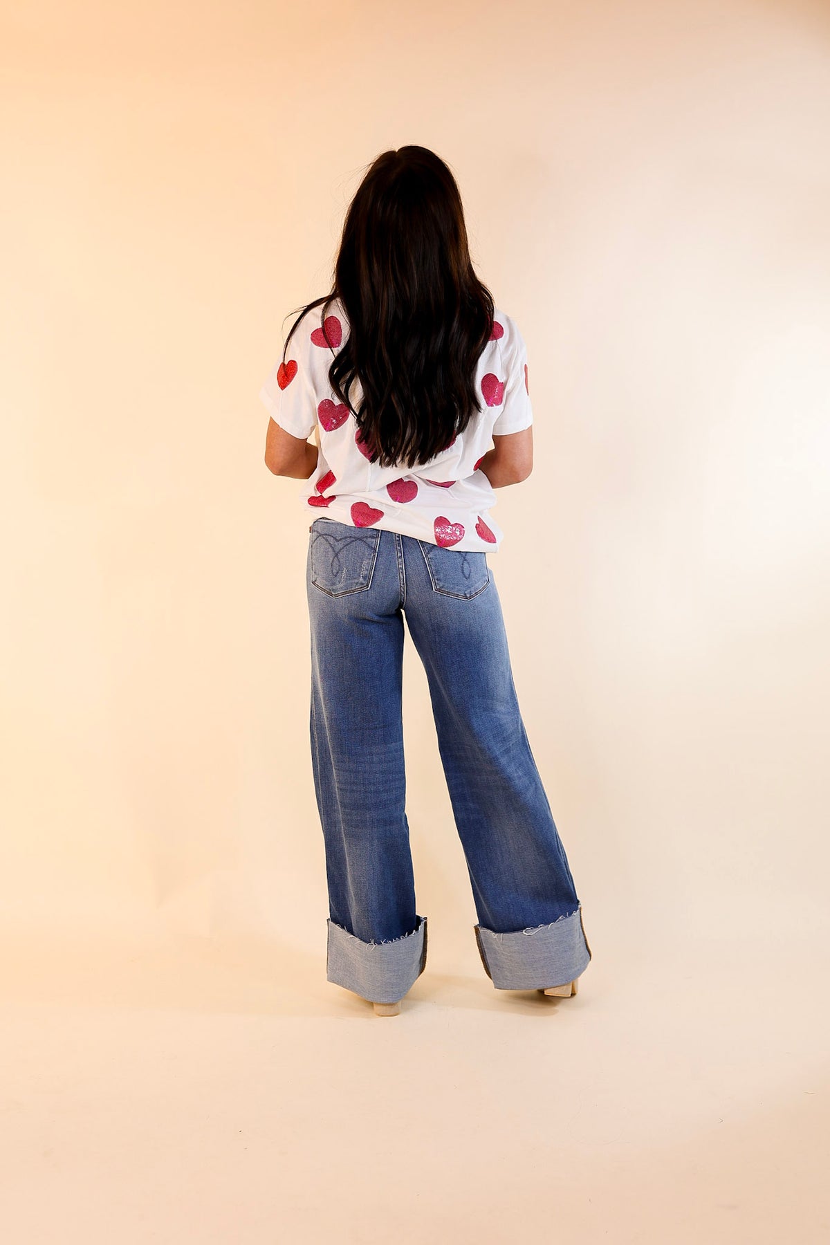 Dive into sweetness with our Queen of Sparkles Lollipop Lane White Crew Neck Tee. Adorned with sequined red lollipops on the front and pink lollipops on the back, this playful top is a delightful treat for your wardrobe. Embrace the whimsical charm and spread joy with every shimmering detail.