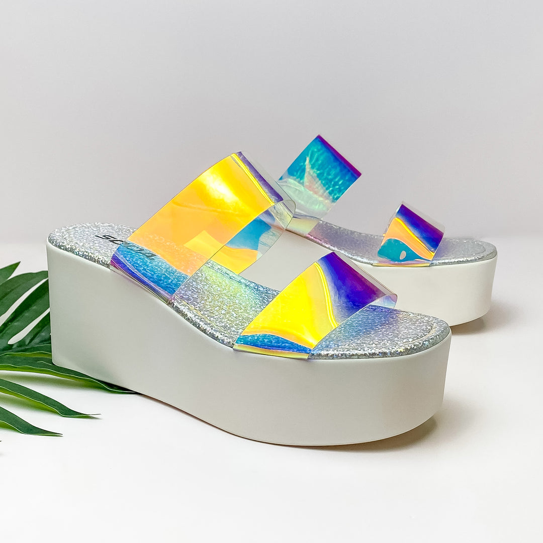 Last Chance Size 8.5 | Feeling Brand New Two Strap White Platform Wedges in Iridescent