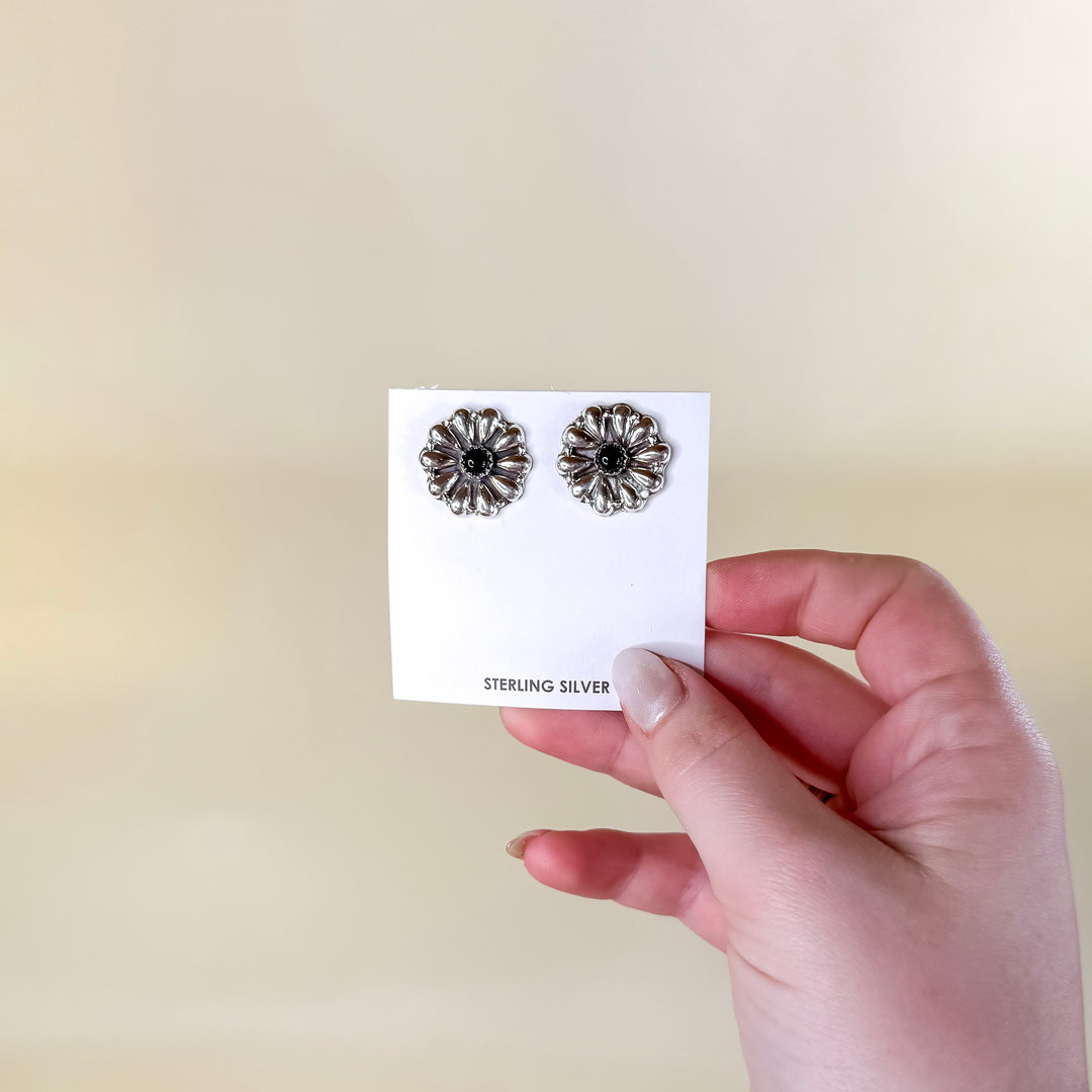 Prismatic Petal Black Stone Flower Concho Stud Earrings