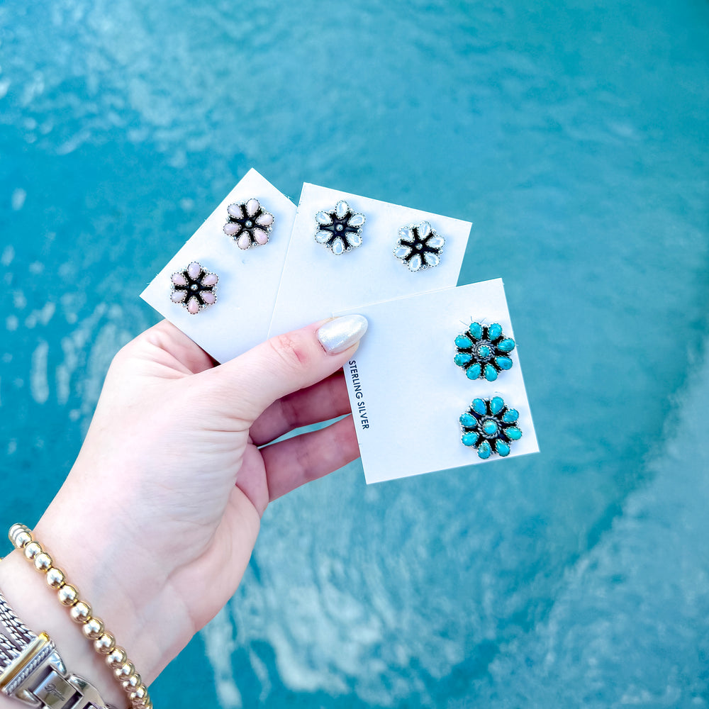 Prismatic Petal AB Stone Flower Concho Stud Earrings in Turquoise