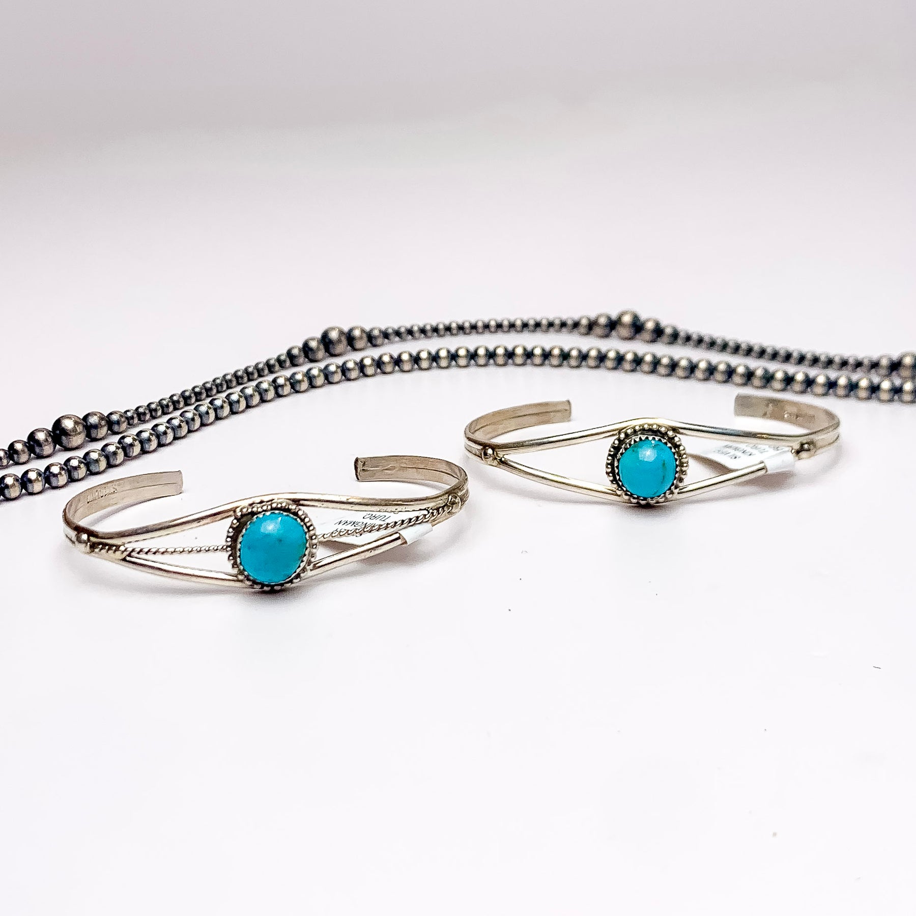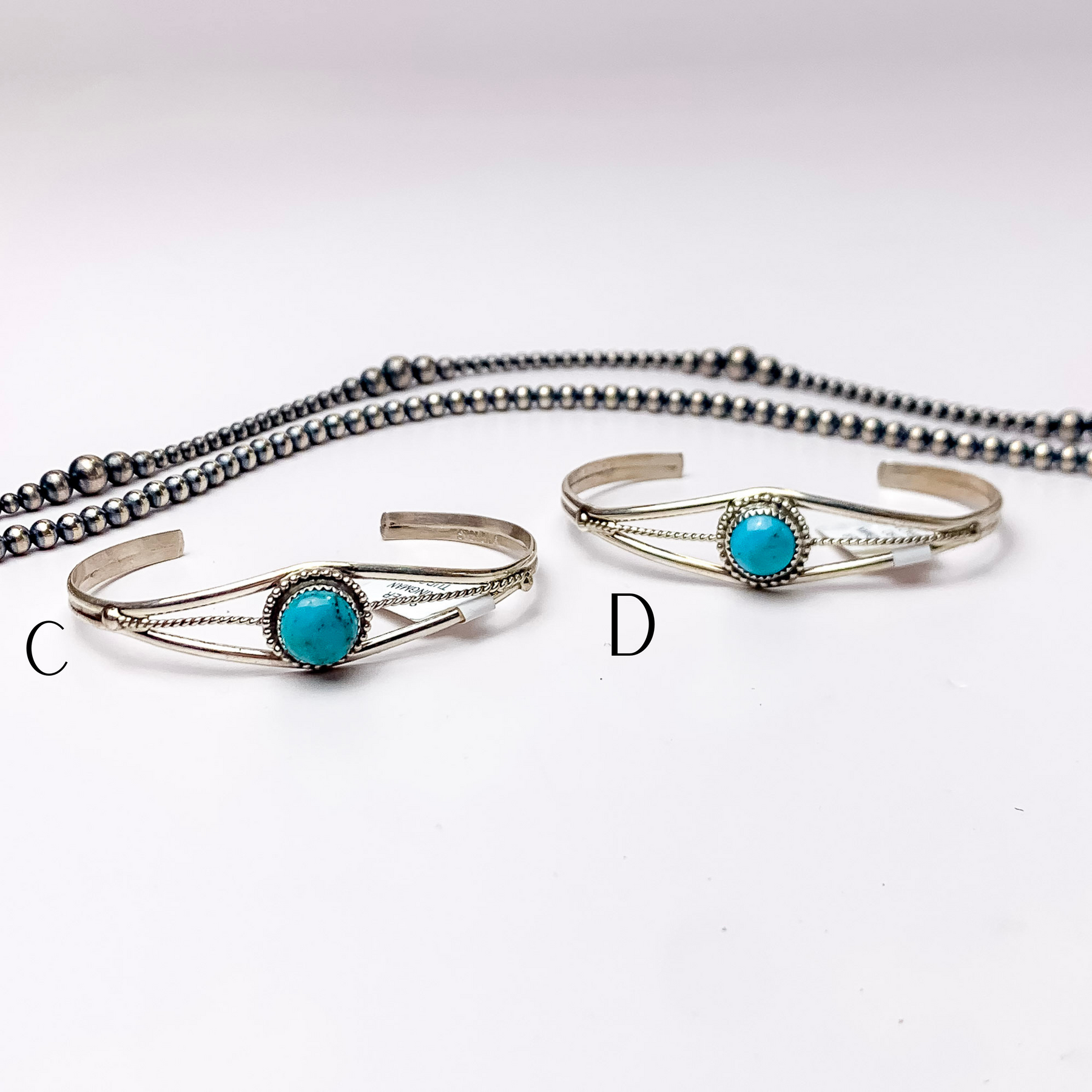 This adorable cuff is genuine Navajo handmade artwork. It includes a detailed sterling silver cuff with a center turquoise stone. Stamped sterling by artist.