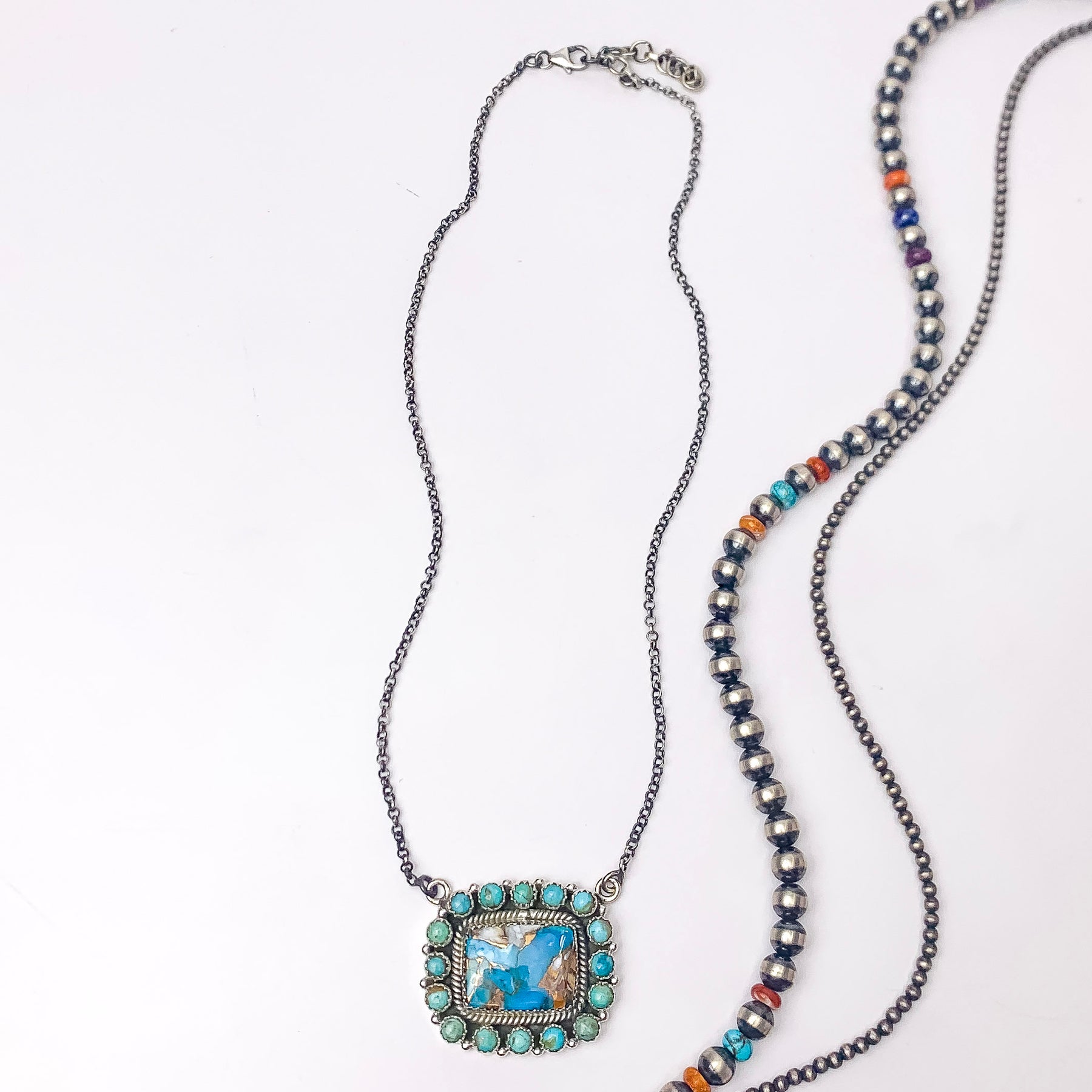 This necklace is a gorgeous handmade sterling silver adjustable chain with a turquoise remix square stone at the center and a small turquoise stone outline. Perfect for a day out and about.