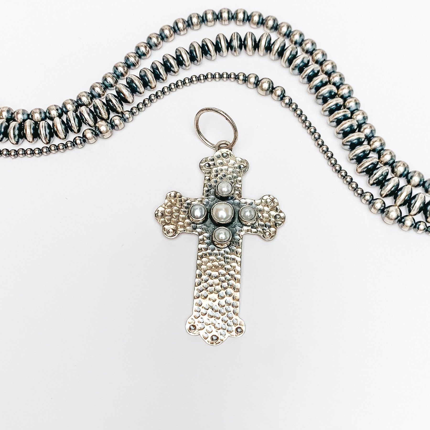 Centered in the picture is a hammered pattern cross pendant with 5 mother of pearl stones. Navajo pearls are laid above the cross, all on a white background.