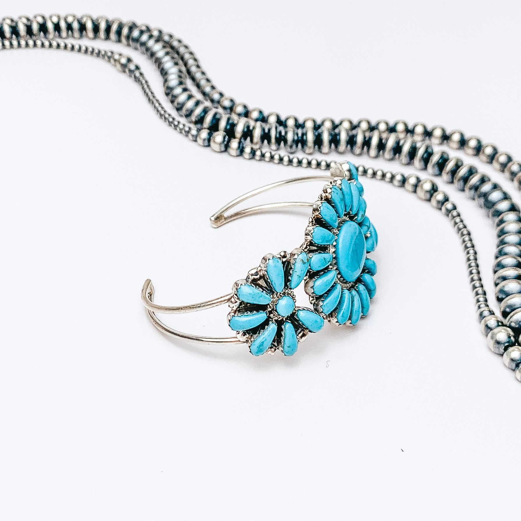 Centered in the picture is a turquoise cluster cuff. In the back of the cuff is navajo pearls. All on a white background.