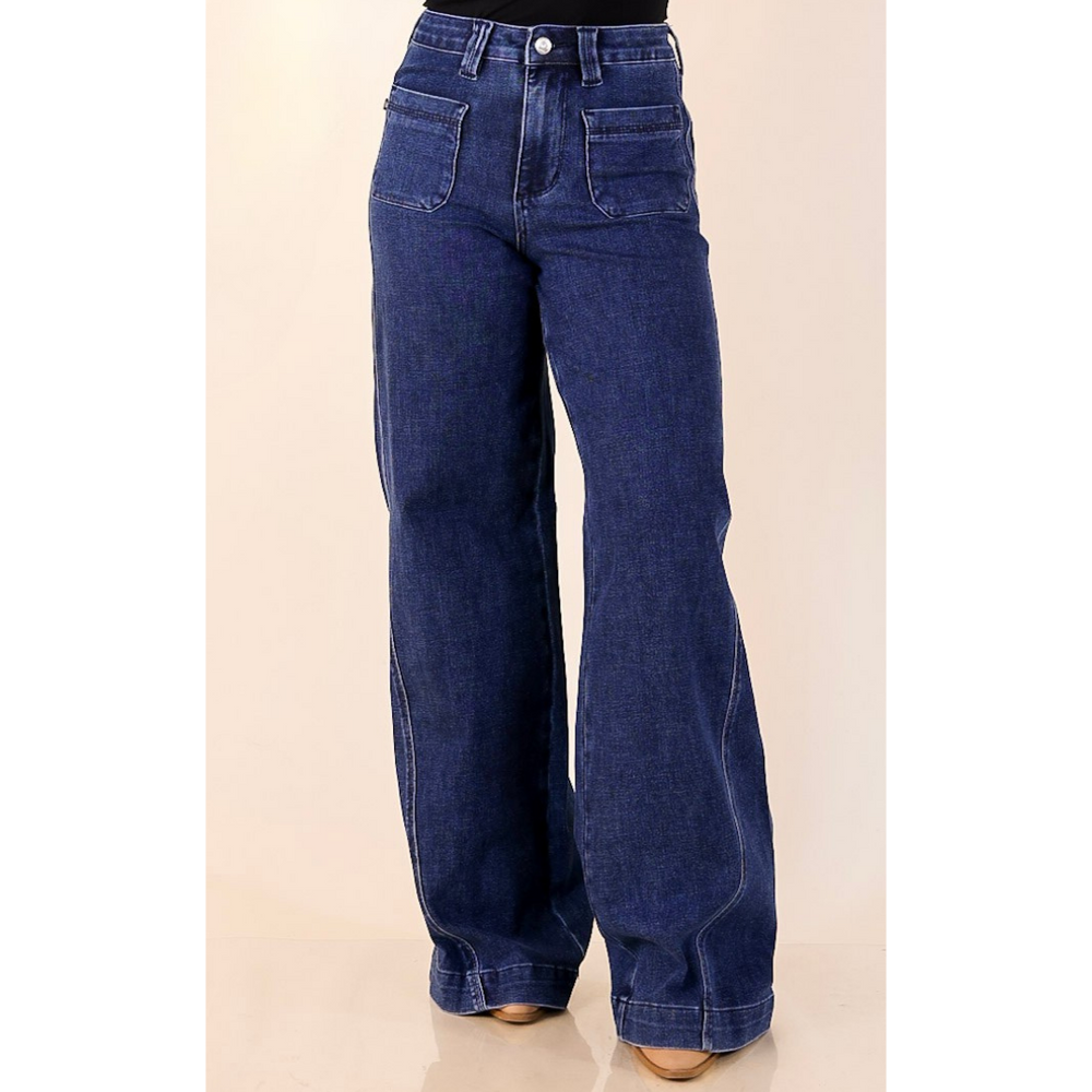 Judy Blue | Front and Center Front Patch Pocket Retro Wide Leg Trouser Jean in Dark Wash