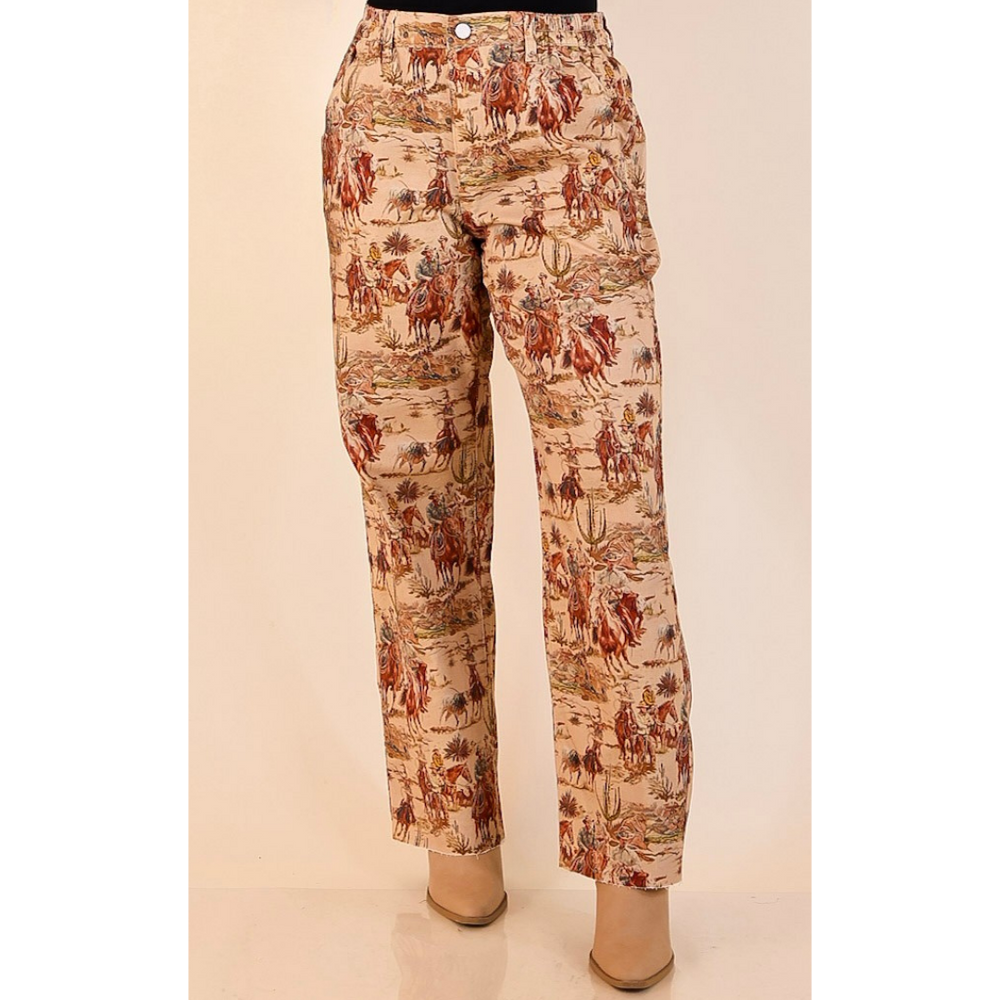 Story of the West Straight Leg Raw Hem Western Print Pants in Taupe Brown