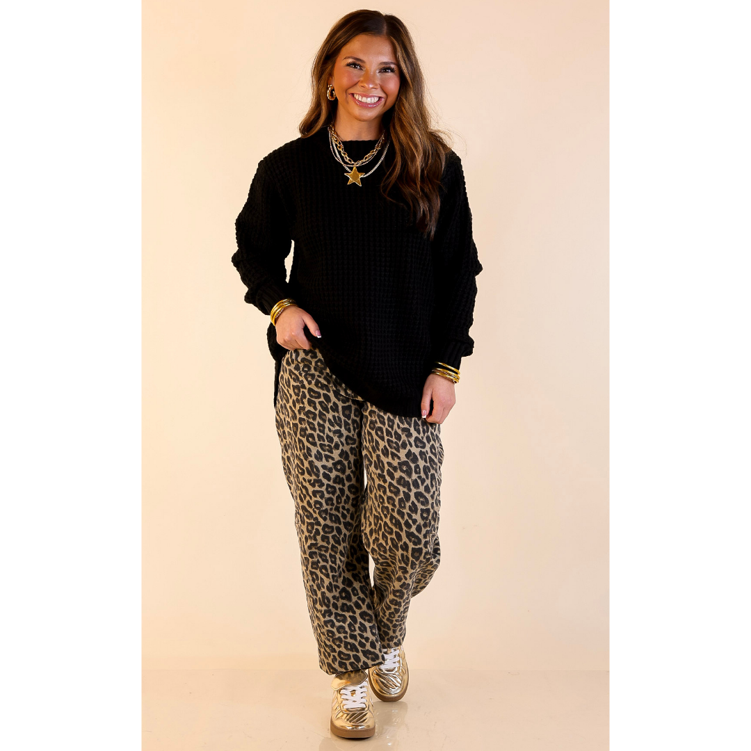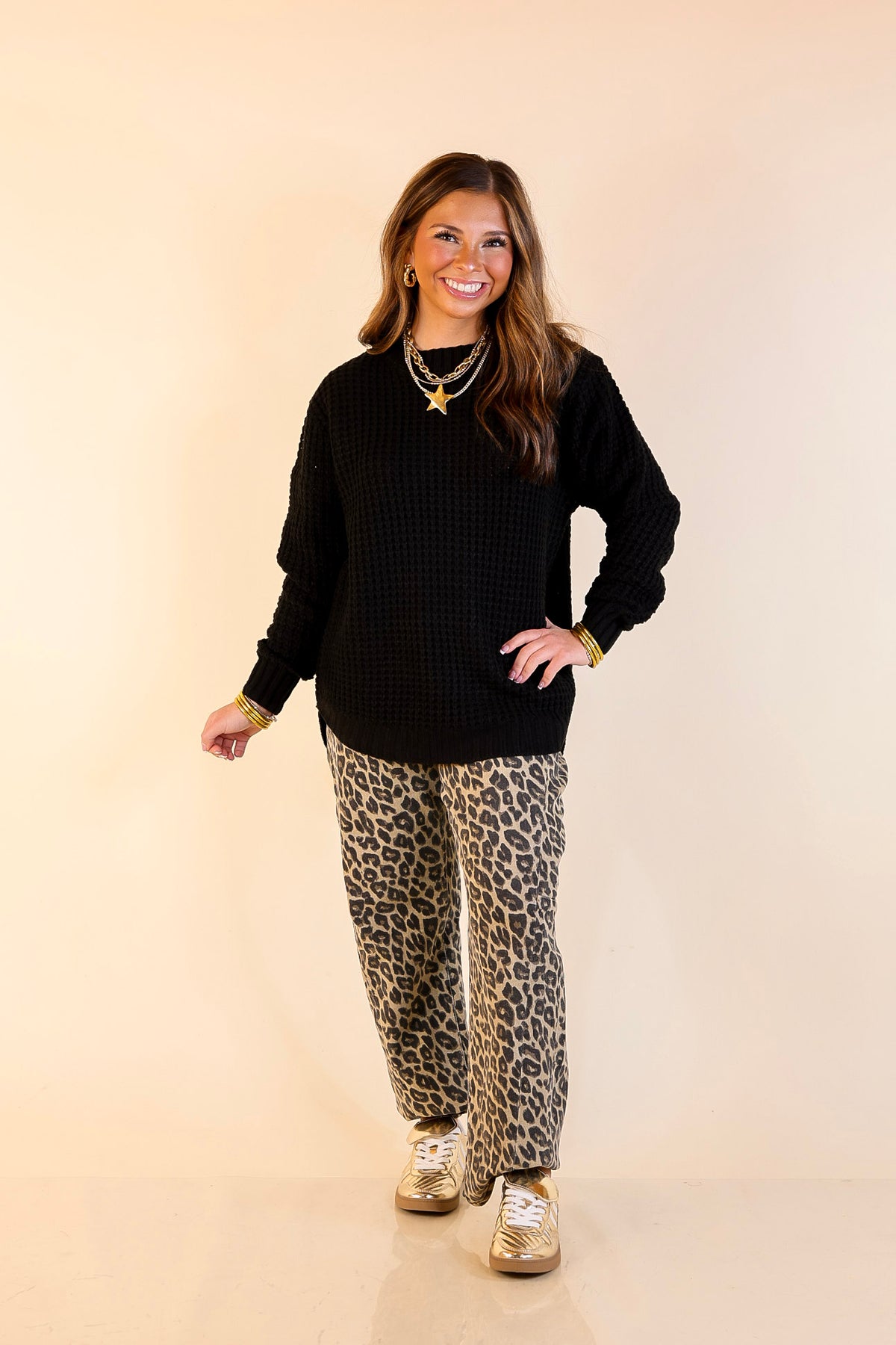 Cool Day Classic Scoop Neck Long Sleeve Large Waffle Knit Sweater in Black