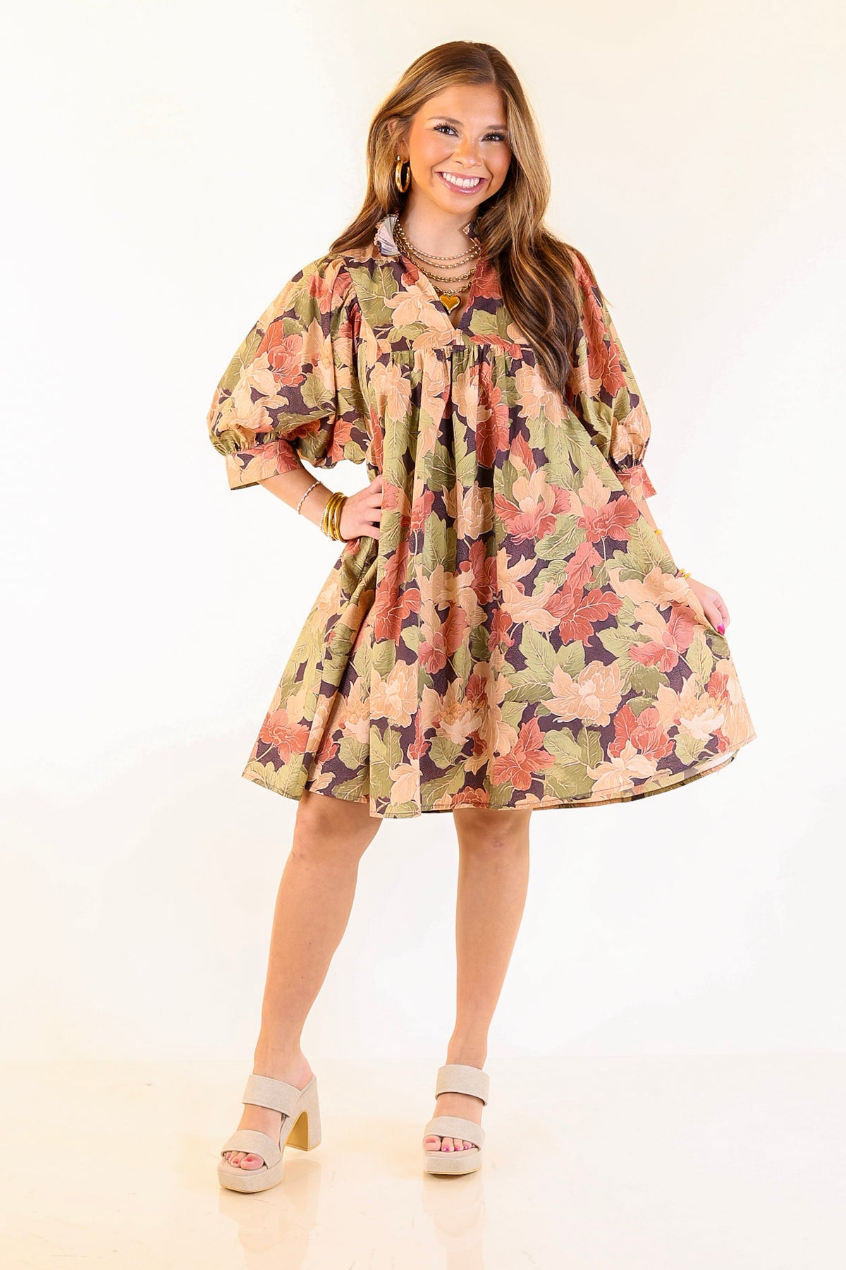 Endless Possibilities Floral Babydoll Dress with Puff Sleeves in Beige, Navy and Rust