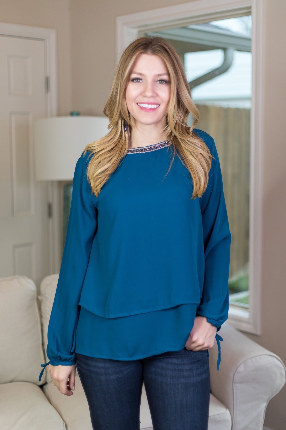 Last Chance Size Small | Glimmer in the Night Blouse with Beaded Neckline in Teal Blue