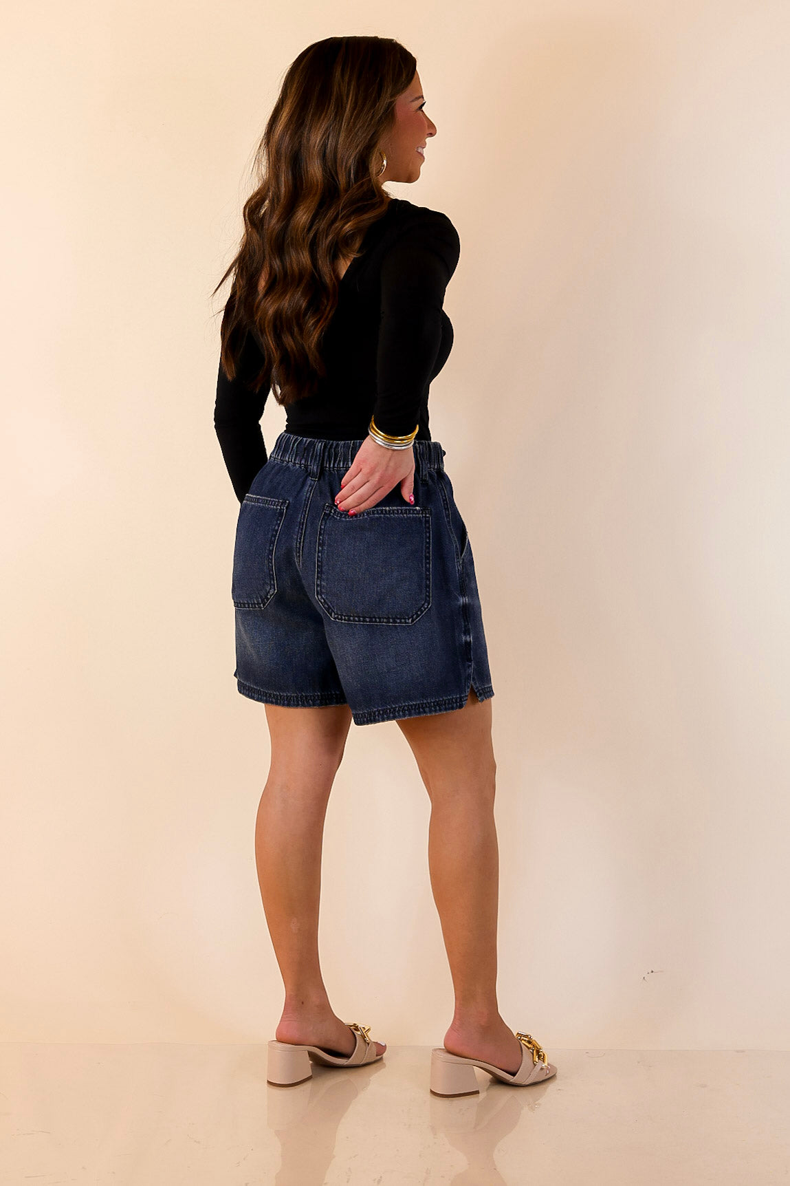 The Easy Company Drawstring Denim Shorts are your go-to for effortless, everyday style — now in a rich dark wash that feels a little more polished while keeping the same easy comfort you love. Designed with a relaxed fit, elastic waistband, and adjustable drawstring, these shorts are made for days when you want to look put together without overthinking it.