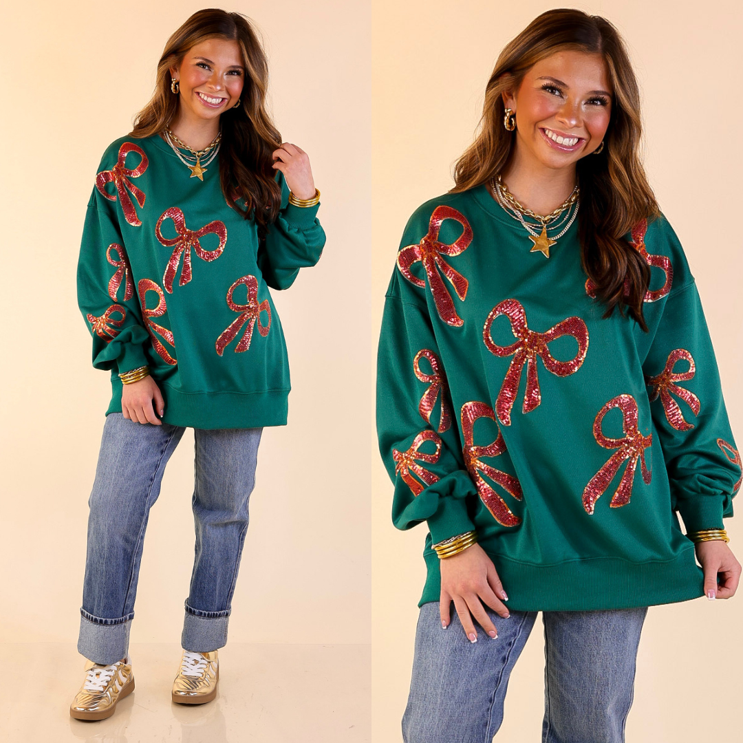 Wrapped in Style Crewneck Sweatshirt with Sequin Red Bows in Dark Green
