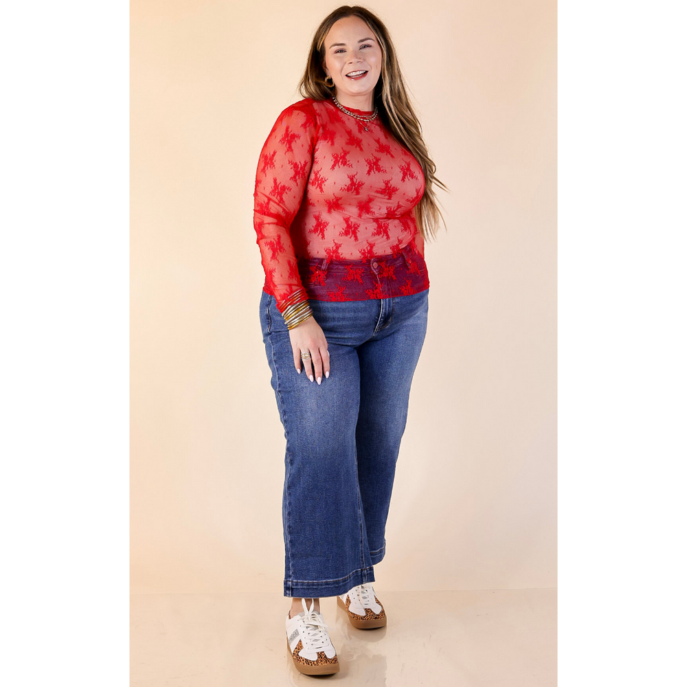 Daringly Delicate Sheer Mock Neck Long Sleeve Lace Top in Red