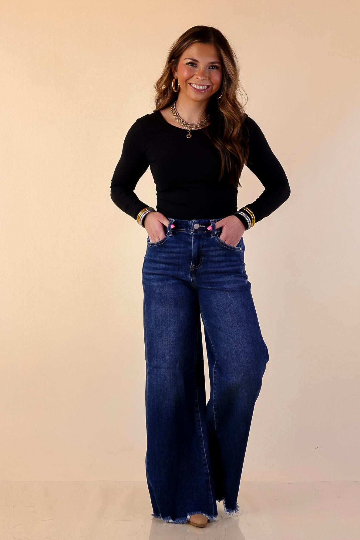 Meet your new go-to denim: the Holding Steady High Rise Wide Leg Jeans. Designed with a confident high rise and a clean wide leg silhouette, these jeans deliver structure where you want it and ease everywhere else. The dark wash keeps them polished and versatile, while the raw hem adds just enough edge to keep things modern.